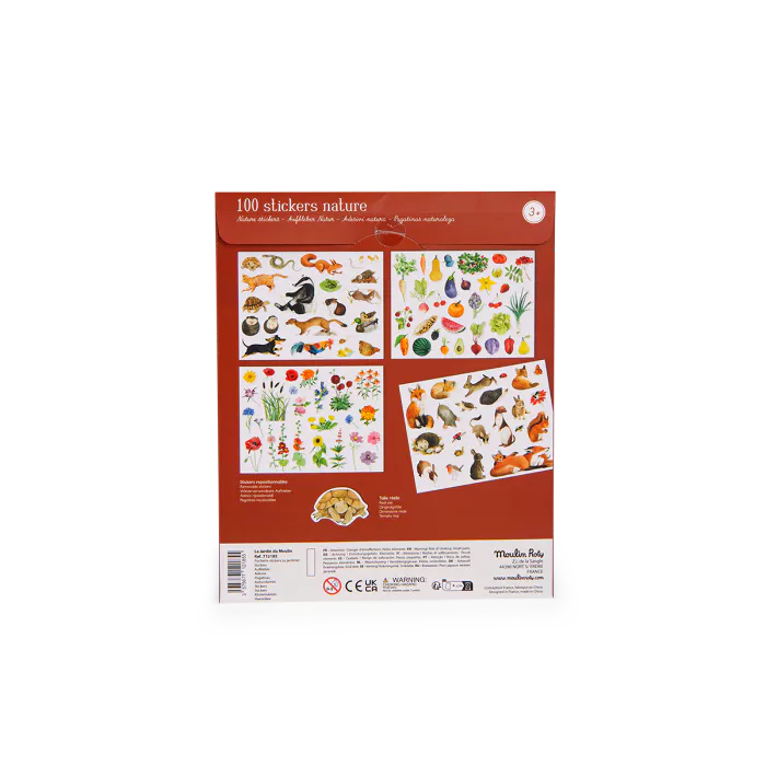Le pack 100 autocollants Nature – Le Jardin du Moulin de Moulin Roty propose quatre planches d’images colorées (fleurs, animaux, insectes, feuillages) inspirées de la nature. Adaptés dès 3 ans, ces autocollants repositionnables stimulent la motricité fine et invitent à la créativité. L’enfant peut les coller sur cahiers, cartes ou créer des scènes imagées. Faciles à manipuler et ludiques, ils offrent des heures de jeu libres, seul ou en groupe. Un cadeau simple, charmant et idéal pour éveiller la curiosité des petits autour du monde végétal et animal.