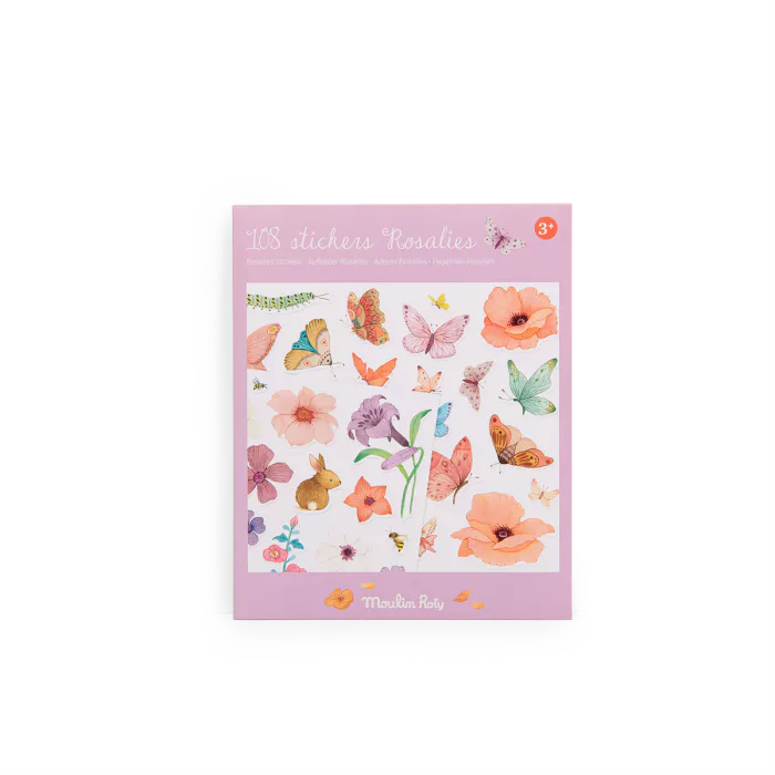 108 stickers Rosalies est un coffret créatif doux et poétique. Il contient 108 autocollants repositionnables, répartis sur 4 planches, tous inspirés de l’univers câlin des Rosalies. Les motifs incluent des fleurs, papillons, petits animaux et détails délicats.