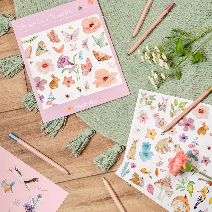 Les stickers sont très faciles à décoller, même pour les petites mains des enfants. L’enfant peut créer, décoller et recréer des scènes encore et encore. Ces autocollants sont parfaits pour personnaliser des carnets, des cartes ou décorer des murs de chambre. Ce kit favorise l’imagination : les enfants inventent des histoires avec les Rosalies tout en s’amusant. Il convient aux enfants dès 3 ans, tout en demandant un peu de précision, ce qui aide à développer la motricité fine. L’activité est calme et apaisante : idéale pour les après‑midi créatifs ou les moments de détente.