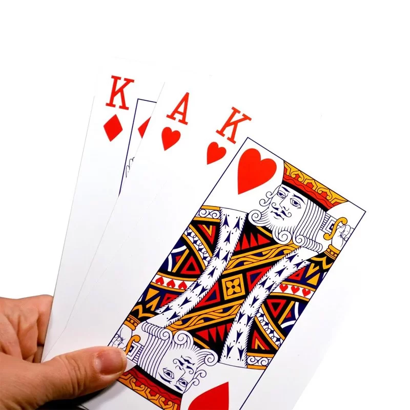 Le paquet contient 54 cartes standards, incluant les 52 cartes habituelles et 2 jokers. Il permet de jouer à tous les jeux classiques : poker, rami, bataille, solitaire ou même des jeux créatifs imaginés par les enfants. La taille XXL rend chaque partie plus visuelle et interactive.