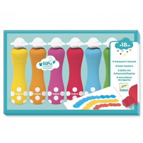 Les 6 marqueurs mousse de Djeco offrent une première approche ludique et créative du dessin et de la peinture. Ce coffret est spécialement conçu pour les jeunes enfants dès 18 mois. Il permet de créer facilement, sans contrainte et sans pinceau. L’enfant appuie. Il tamponne. Il colore. Le geste est simple et intuitif.