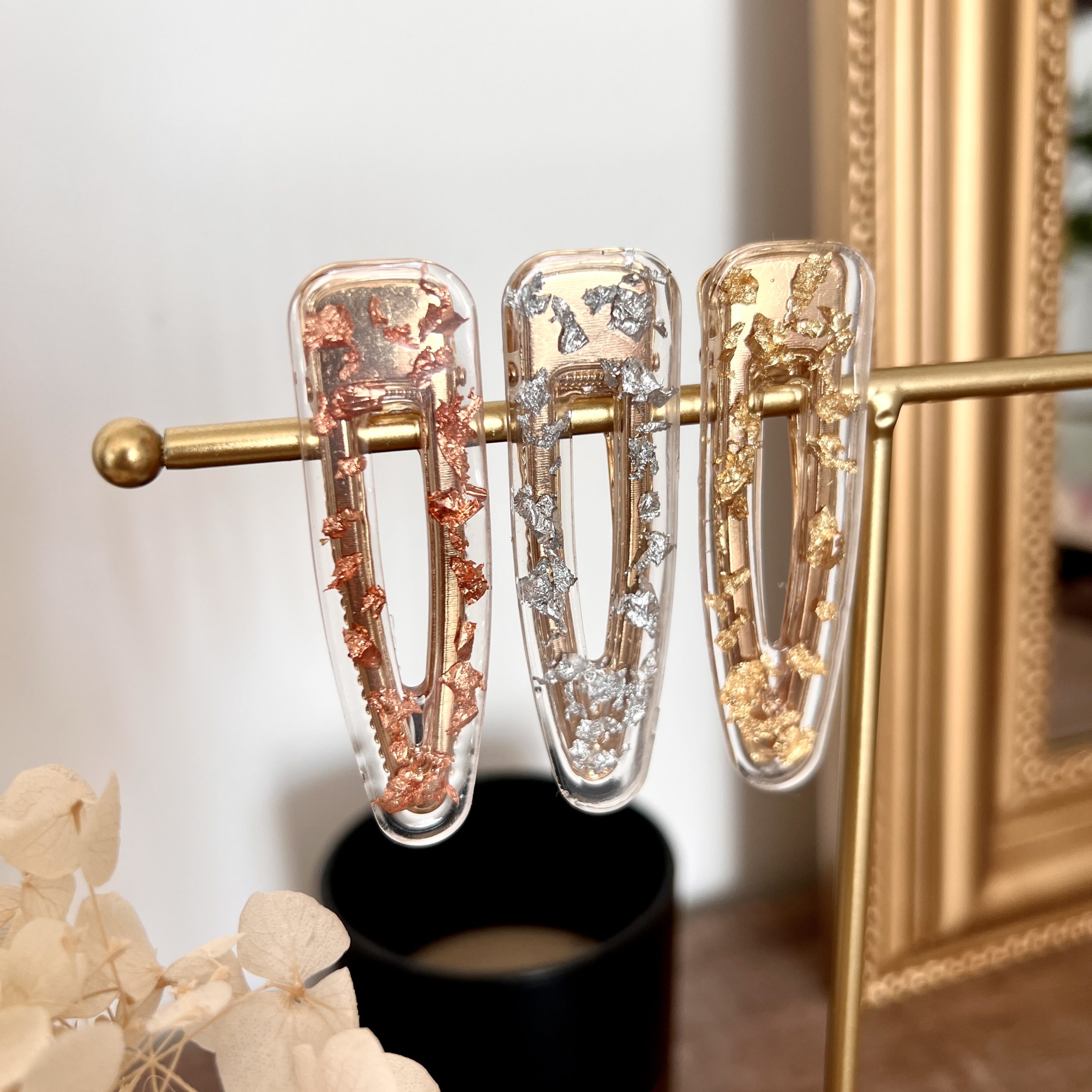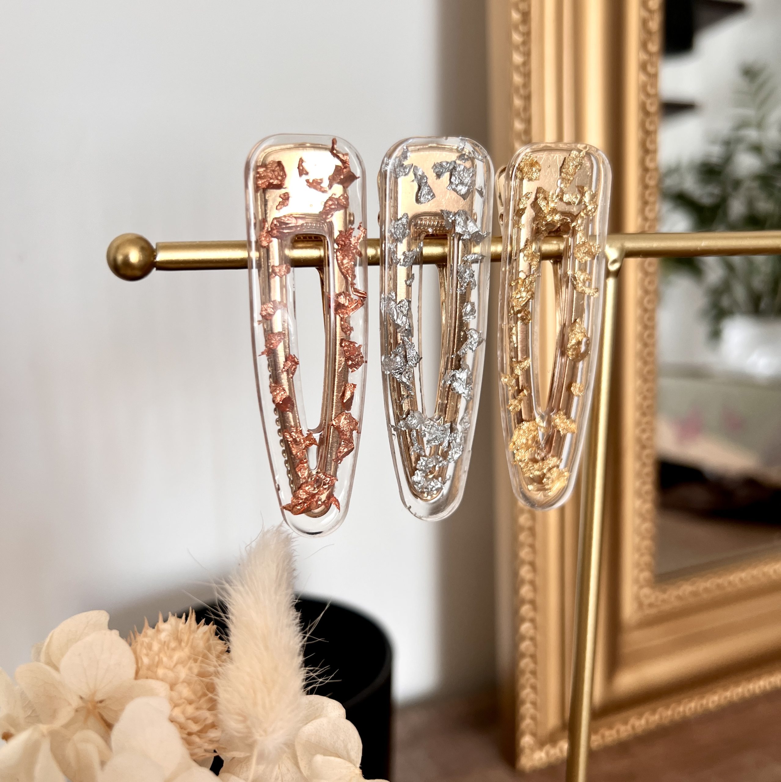 - Jolie barrette triangulaire dorée en résine et feuille d’or. Chic et élégante à la fois, elle est idéale pour un événement comme une cérémonie ou pour apporter une touche chic et bohème à votre coiffure de tous les jours. C’est donc un véritable bijou de cheveux!