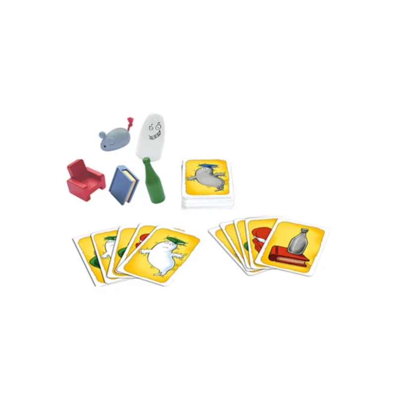 Pour les pièces en bois : la bouteille est verte, le fantôme est blanc, le fauteuil est rouge, le livre est bleu et la souris est grise ! Mais sur les cartes, toutes ces couleurs se mélangent… Il y a 2 objets sur chaque carte, et dès que l’une d’elle est retournée, il s’agit d’être le plus rapide à choper le bon objet : si la carte présente un objet de la bonne couleur, il faut vite l’attraper ; mais si les 2 objets représentés ne sont pas de la bonne couleur, alors il faut vite attraper l’objet qui n’a rien de commun avec la carte : ni l’objet, ni la couleur !