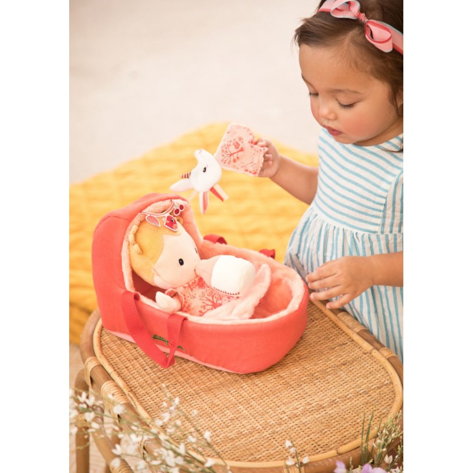 Bébé Lena fait dodo, avec son doudou, sous une petite couverture, dans son berceau tout doux. Un bébé à dorloter dès 12 mois.