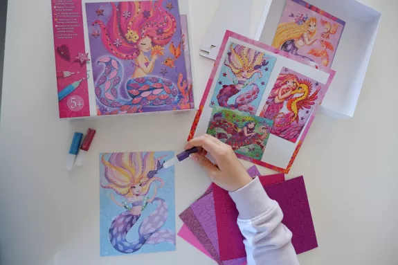 Les enfants pourront embellir et faire scintiller les cartes à l’aide des formes pailletées et des stylos à encre brillante.