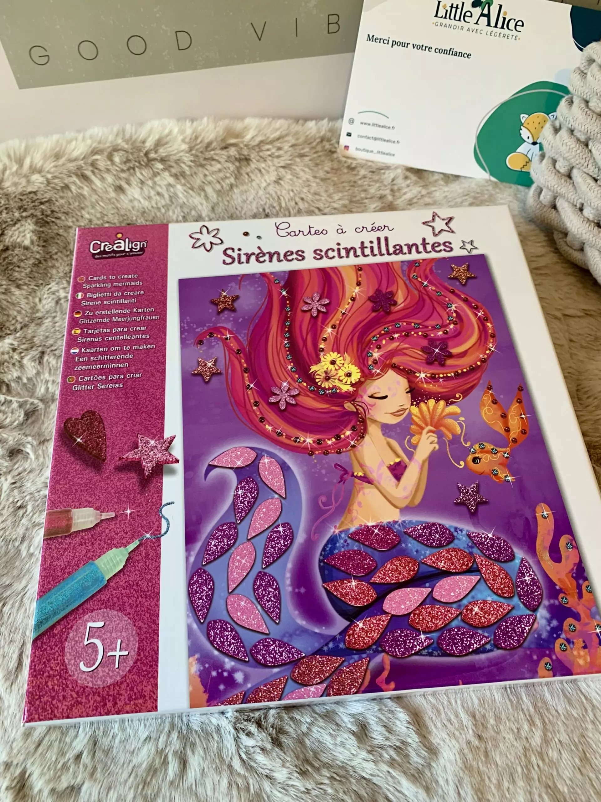 6 cartes, 5 planches de formes scintillantes, 3 stylos encre pailletée et un chevalet