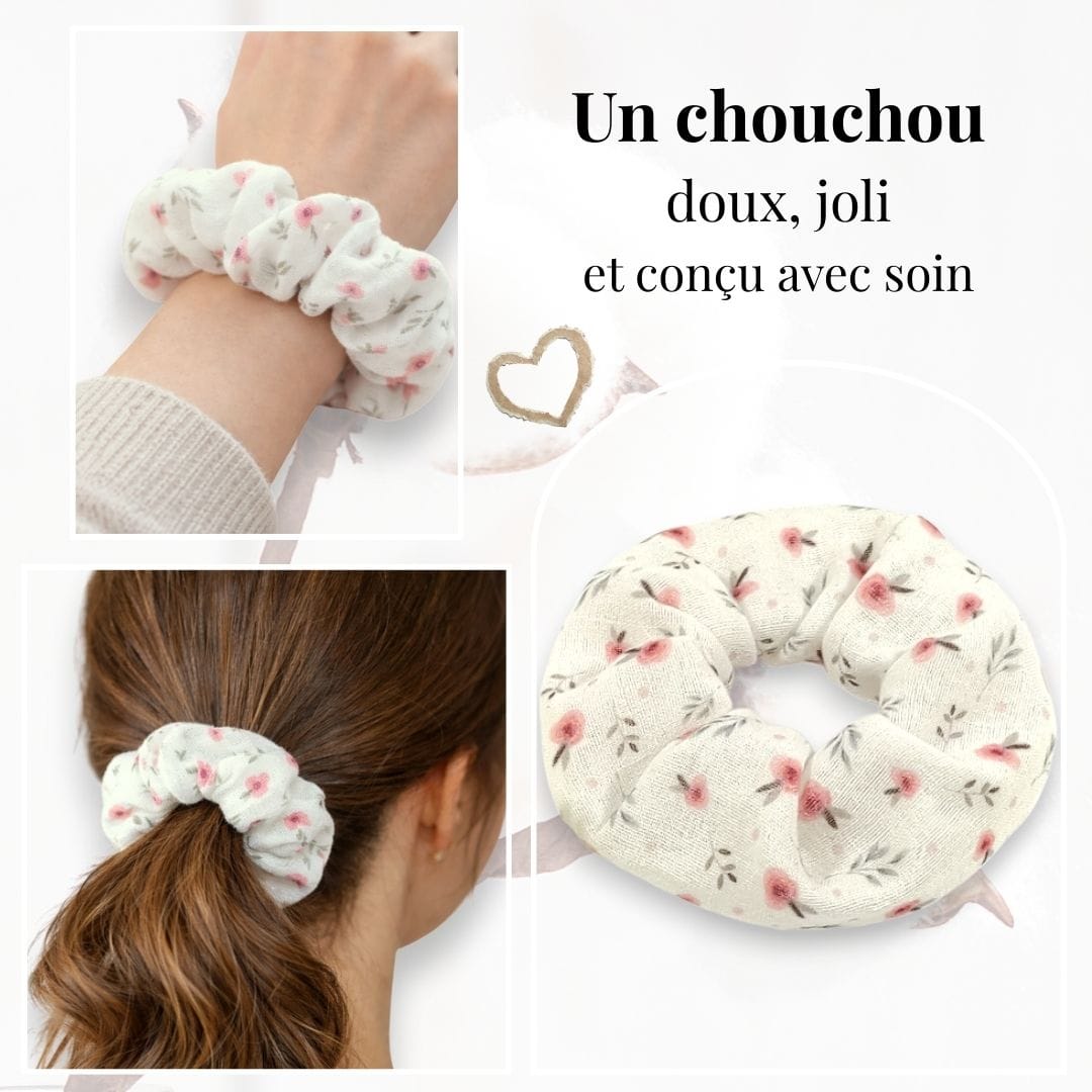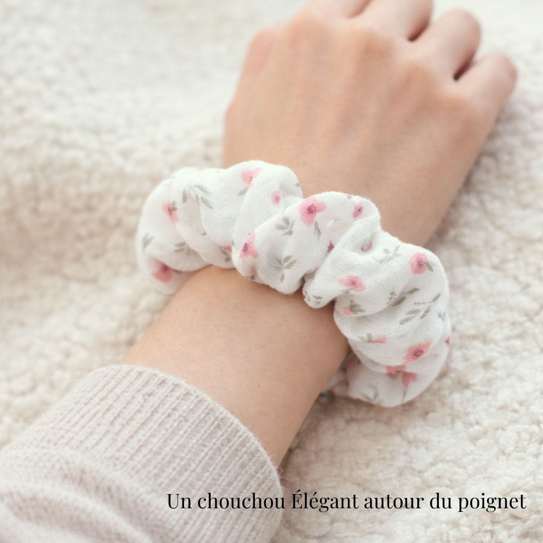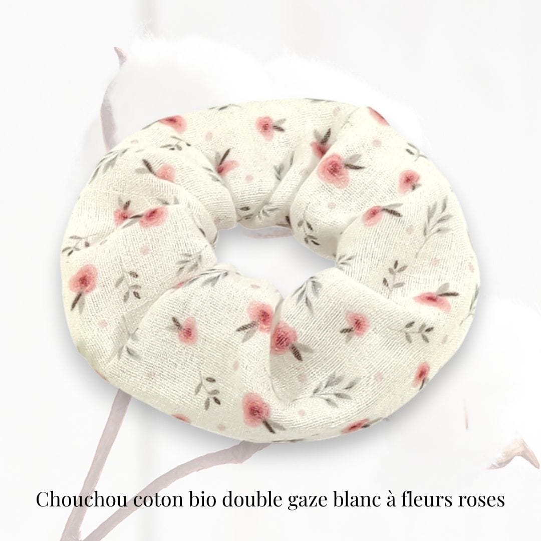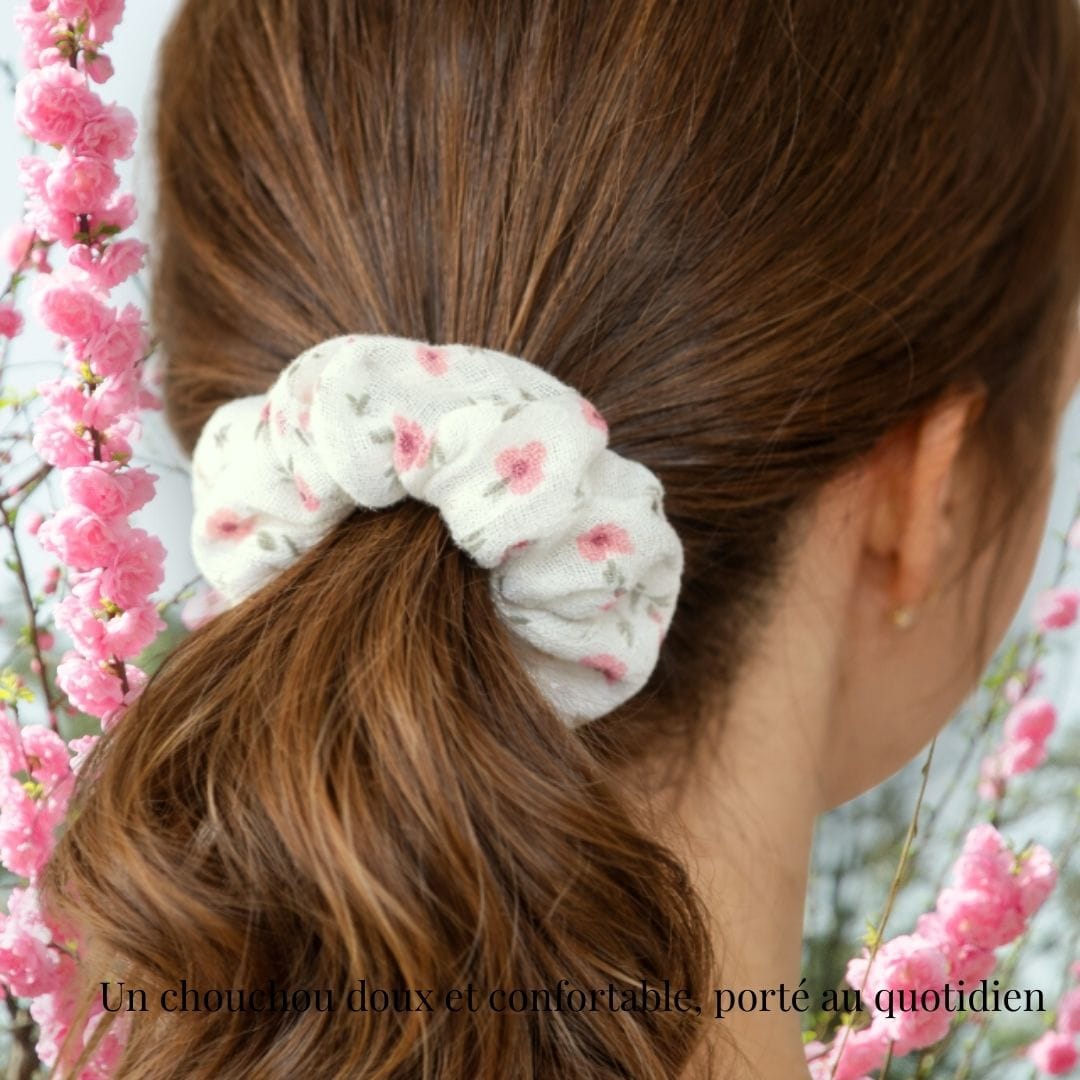 Ce Chouchou coton bio double gaze, blanc à fleurs roses, est un accessoire cheveux délicat et responsable, pensé pour sublimer vos coiffures avec douceur et conscience.