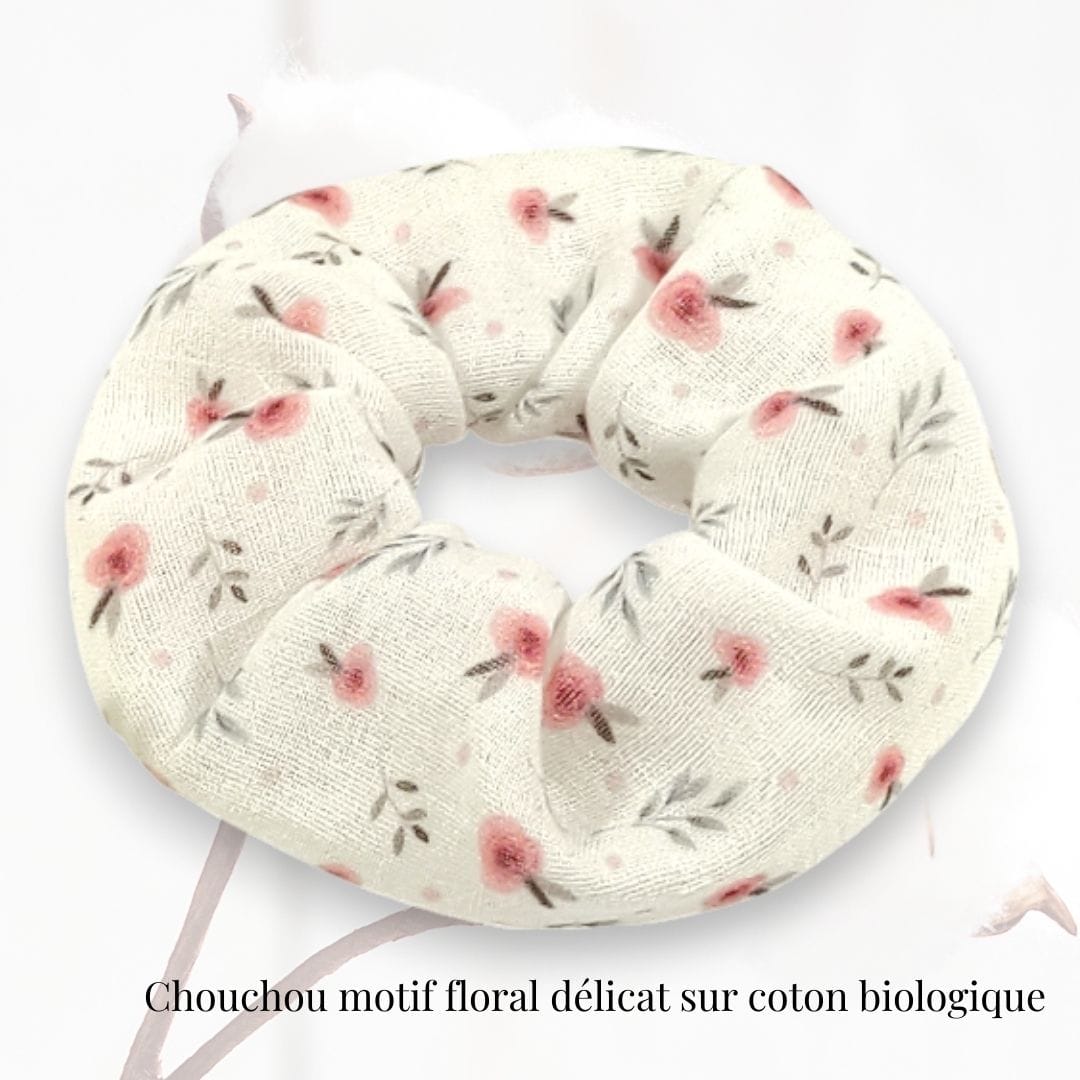 Chouchou coton bio double gaze, délicatement confectionné dans mon atelier artisanal, se décline ici dans un fond blanc parsemé de petites fleurs roses, pour une touche douce, romantique et intemporelle. Réalisé en double gaze de coton biologique certifié GOTS, il associe confort, élégance naturelle et engagement éthique.