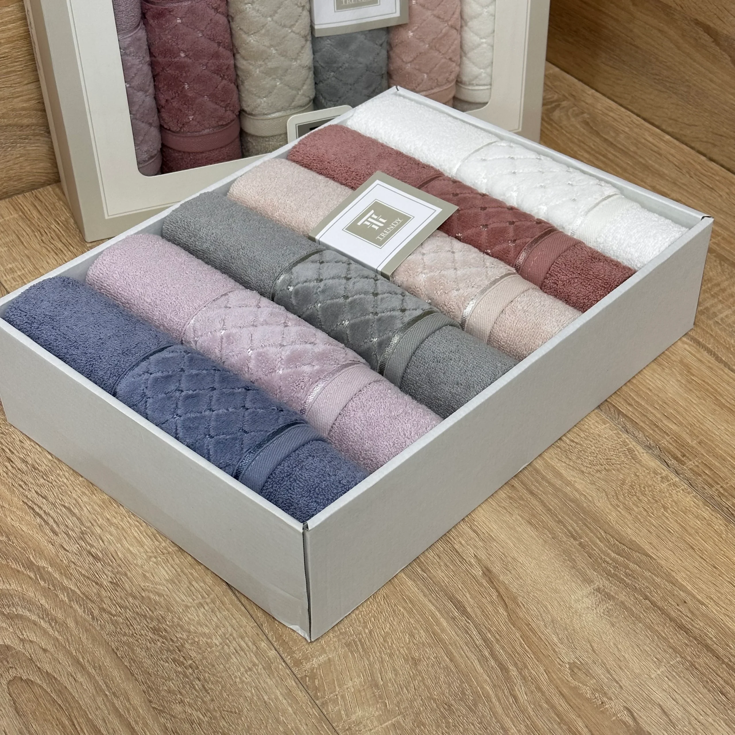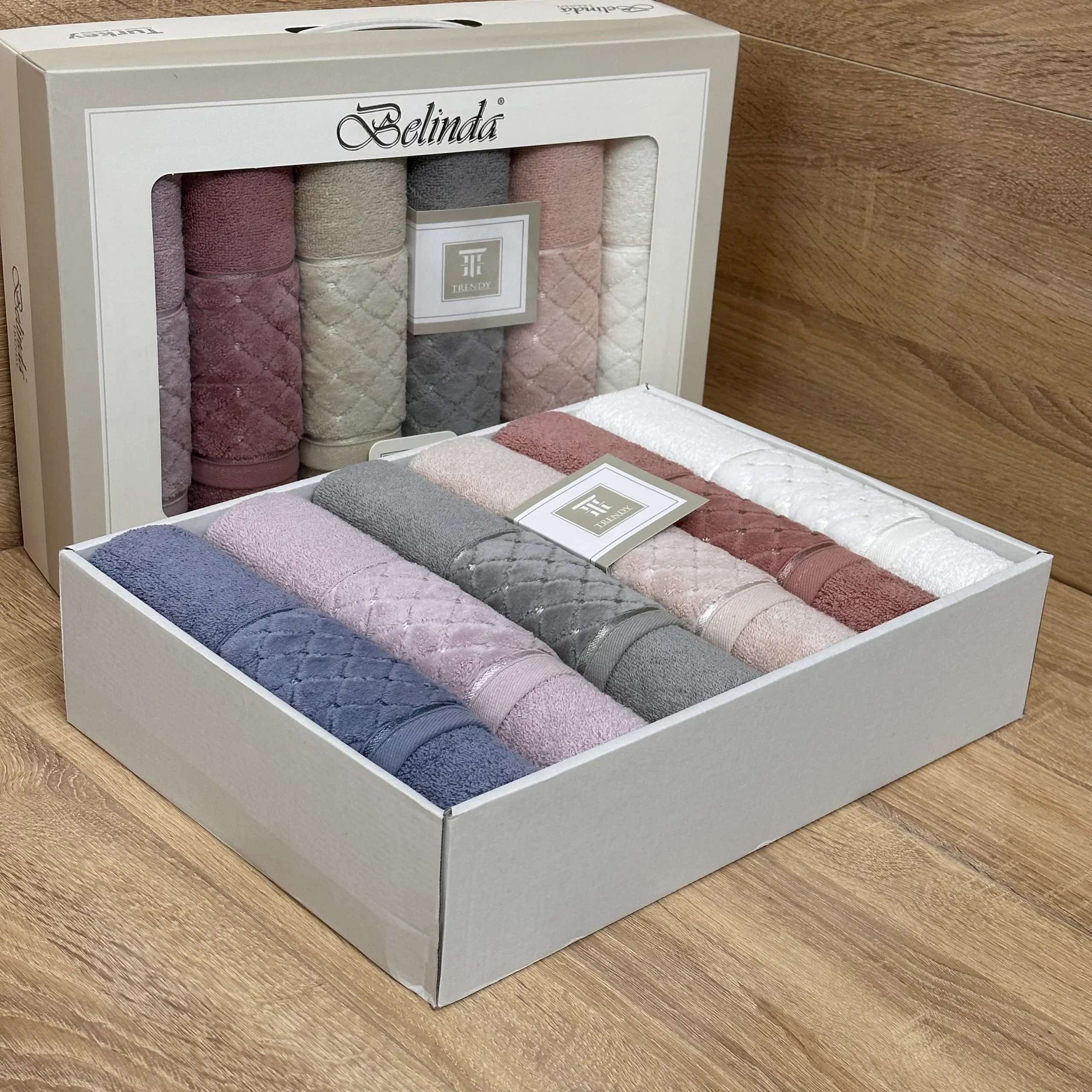 Découvrez le coffret exclusif de 6 serviettes de bain (90×50 cm) de la marque BELINDA, modèle TRENDY, reconnu pour sa qualité premium en coton épais et ultra-doux. Son packaging moderne et raffiné en fait un choix idéal pour offrir en cadeau.