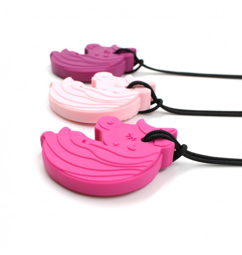 Tout droit sorti des contes de fées – un collier de licorne à croquer ! Utilisez ce collier à mâcher comme une alternative sûre à la mastication des manches de chemise, des cols, des crayons, des doigts, des ongles, etc. pour aider à calmer, se concentrer et s’autoréguler. Mesurant environ 2,5 cm de large, 5 cm de haut et 0,9 cm d’épaisseur, ces licornes sont parfaites pour ceux qui préfèrent mâcher avec leurs prémolaires et/ou leurs dents de devant. Niveau de résistance médium : recommandé pour les grands mâcheurs qui apprécient une certaine souplesse. Collier réglable.