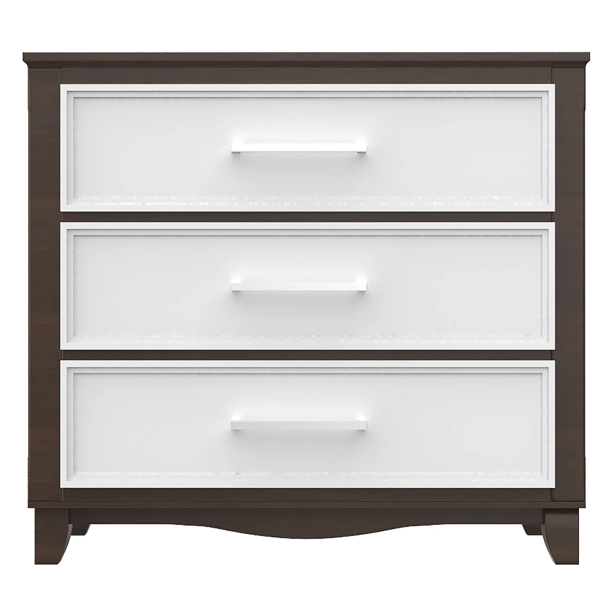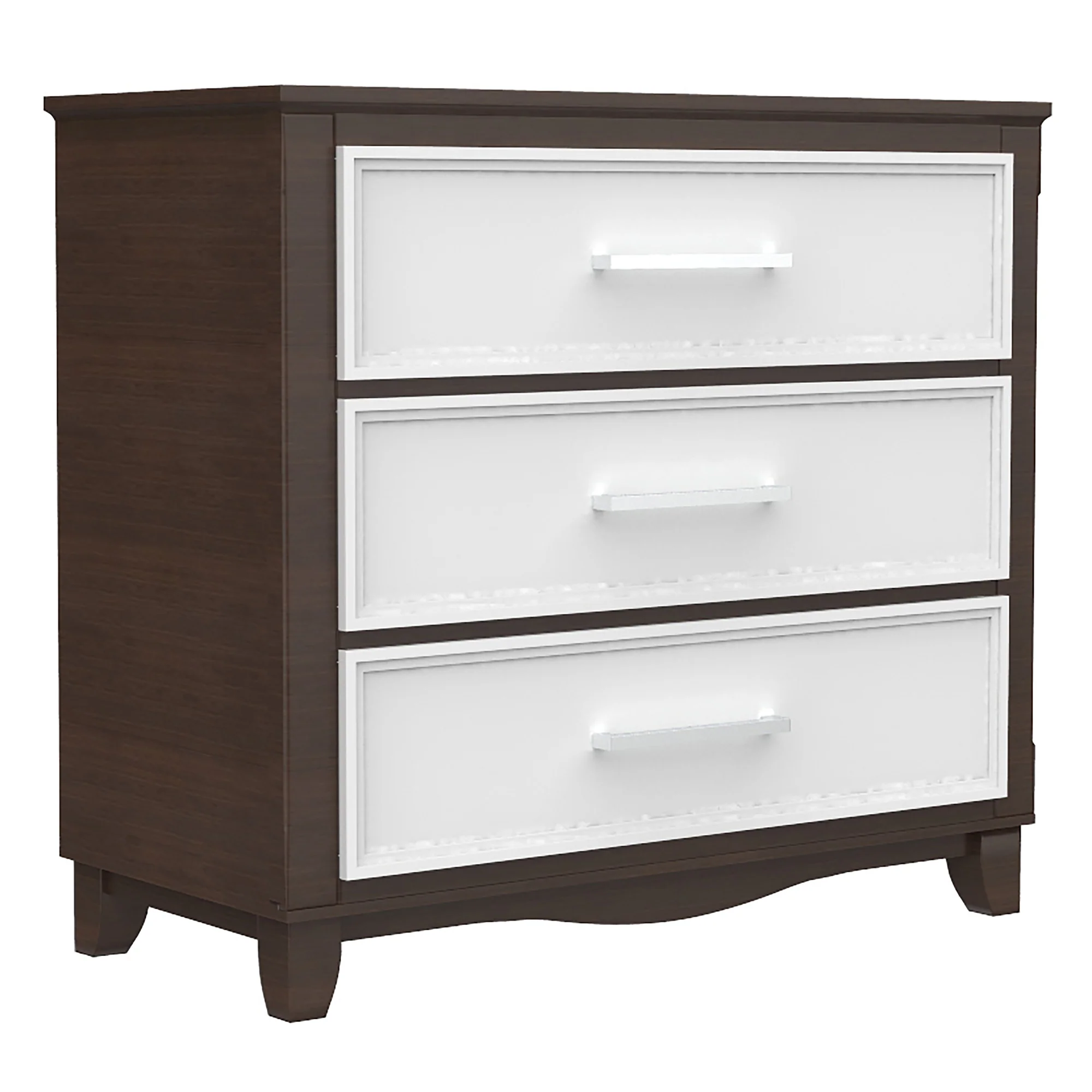 Commode 3 tiroirs bella pour chambre, blanc et noyer
