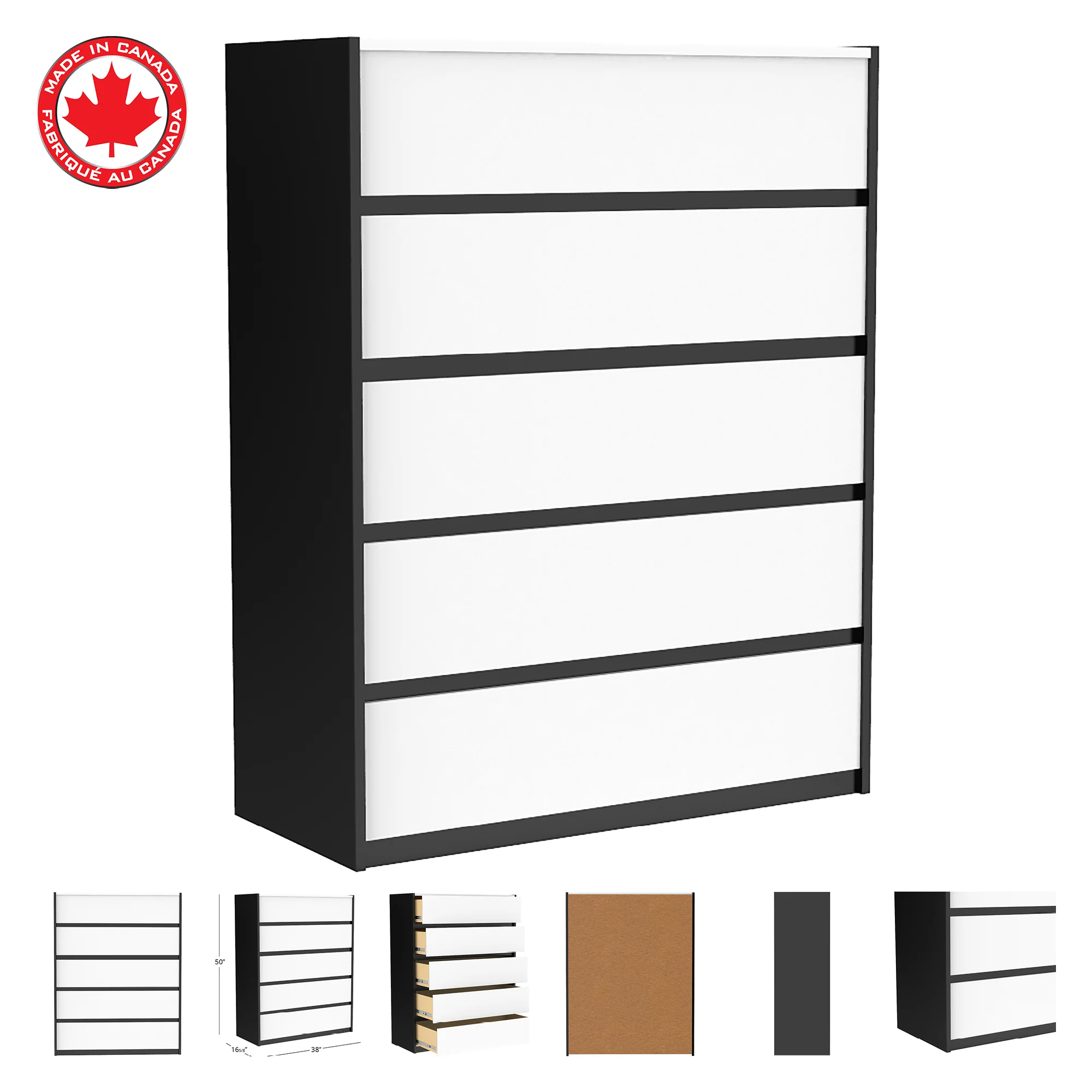 Barton commode de rangement 5 tiroirs pour chambre, java & blanc