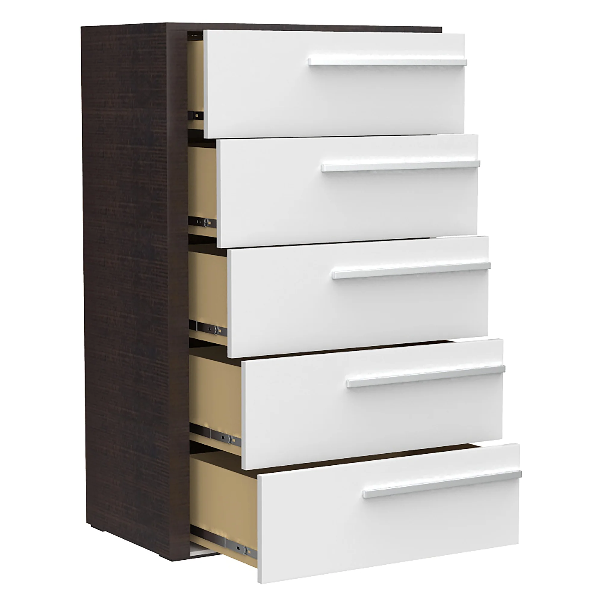 Rangement et organisation pratiques avec 5 grands tiroirs avec poignées droites en métal, ce coffre de rangement à 5 tiroirs offre beaucoup d’espace pour les vêtements ou le linge de maison, ou même les couches de votre bébé. Comprend des glissières de tiroir en métal pour une utilisation fluide et silencieuse.