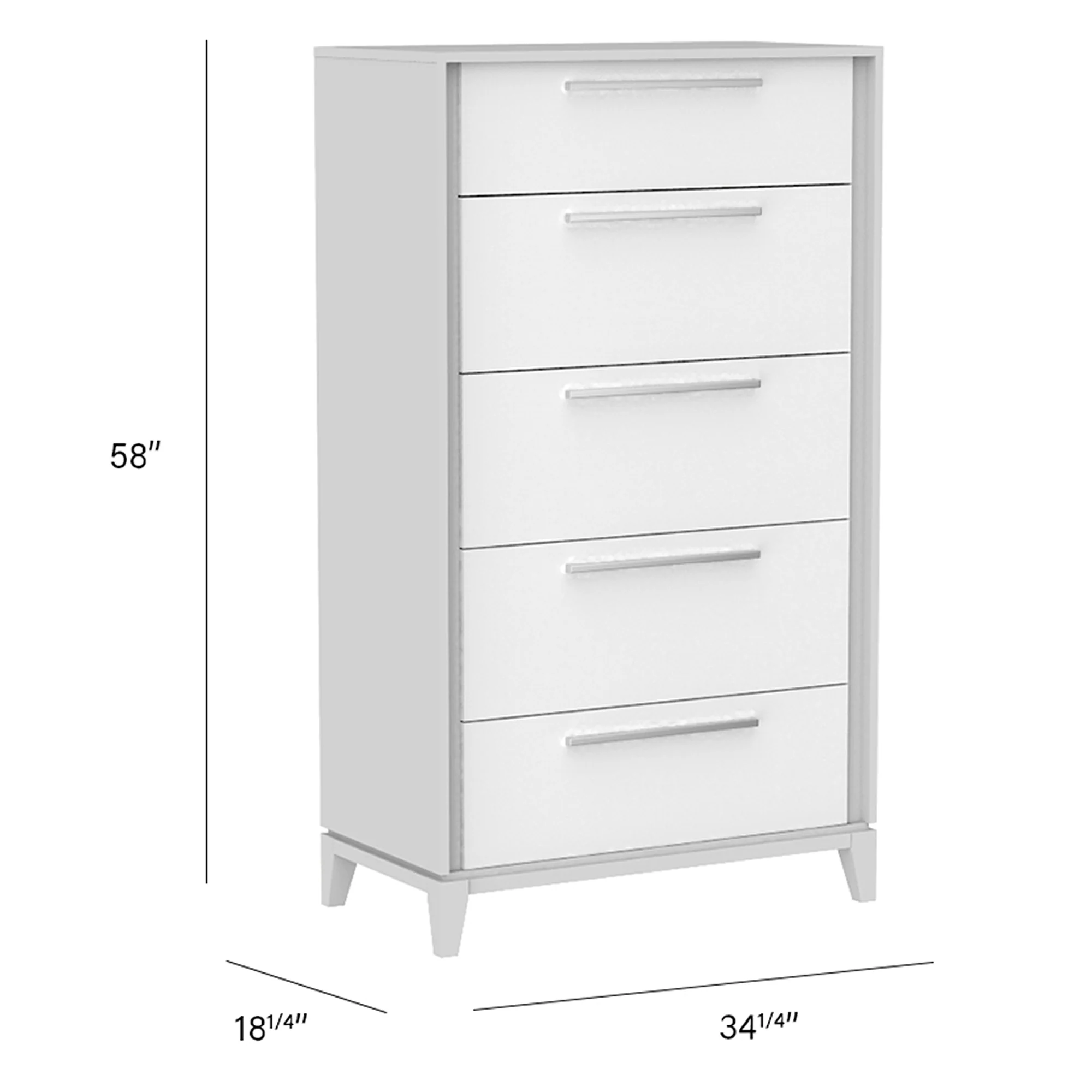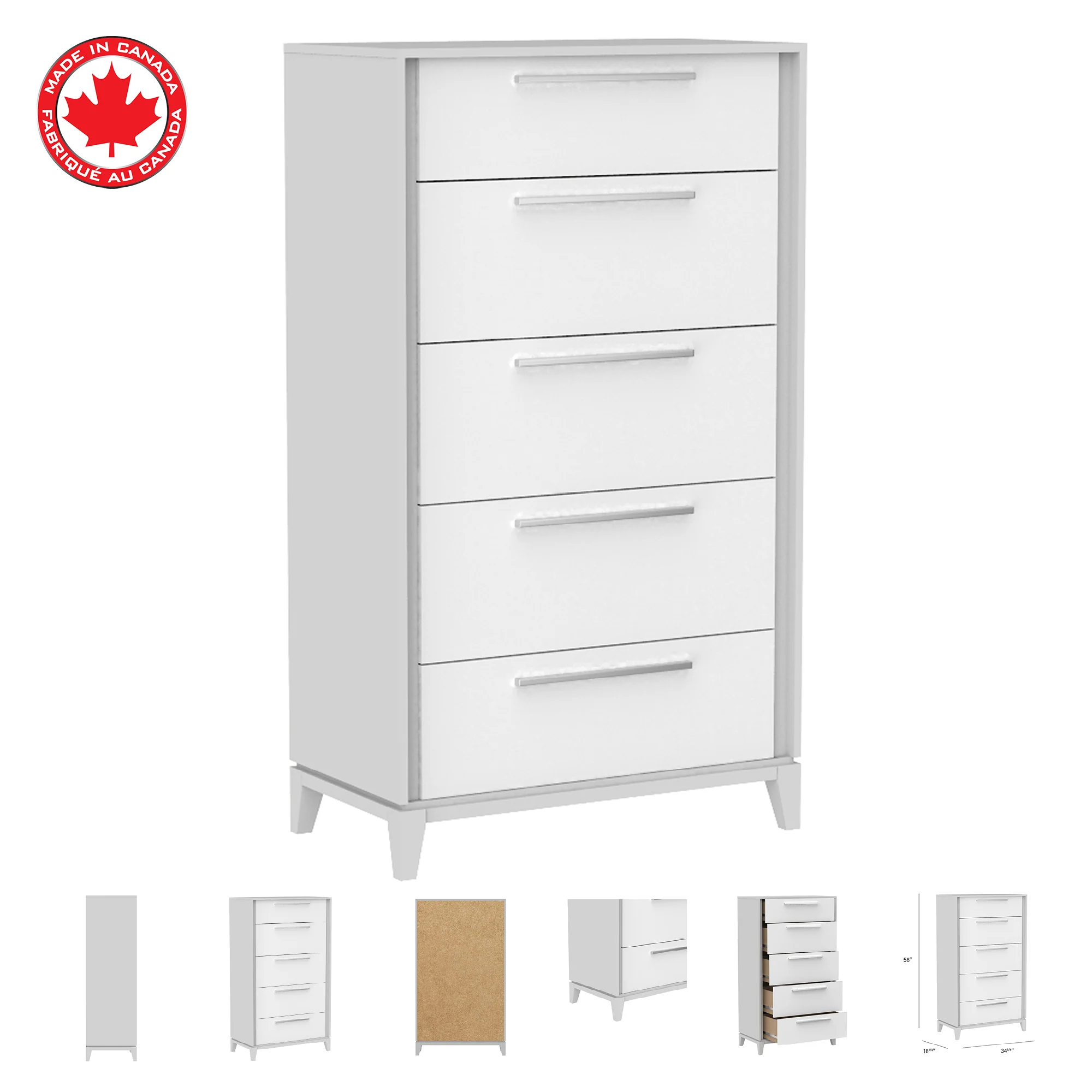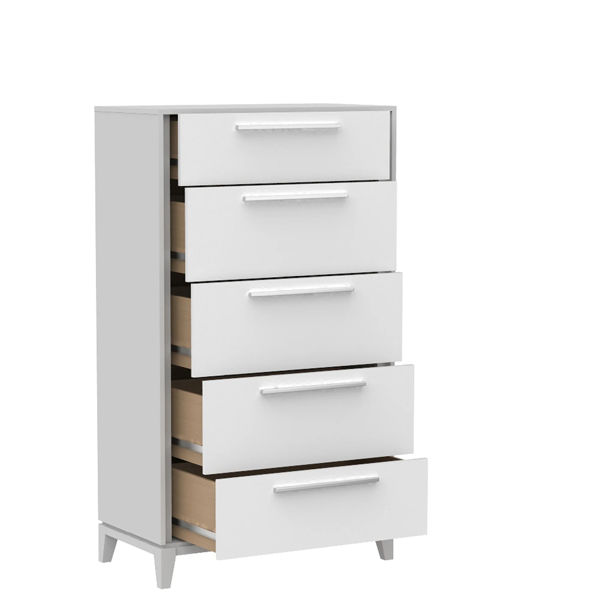 Commode 5 tiroirs moderna pour chambre, gris et blanc