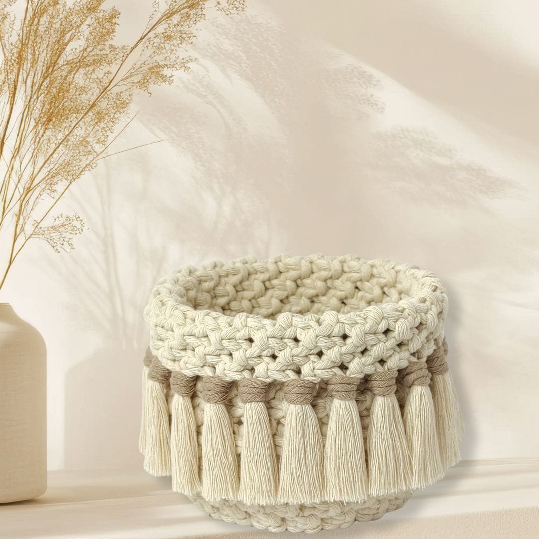 Corbeille macramé beige artisanale : une touche bohème chic pour votre intérieur