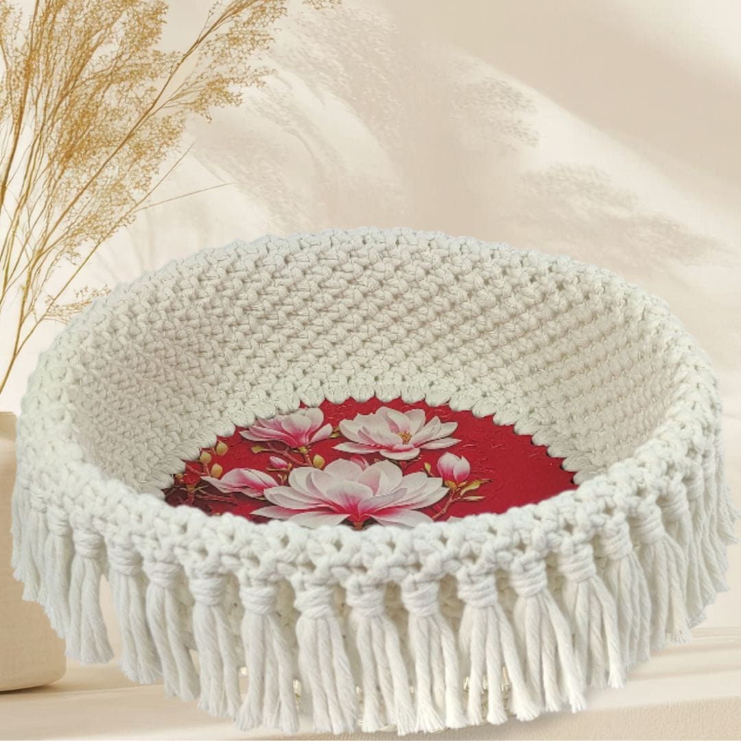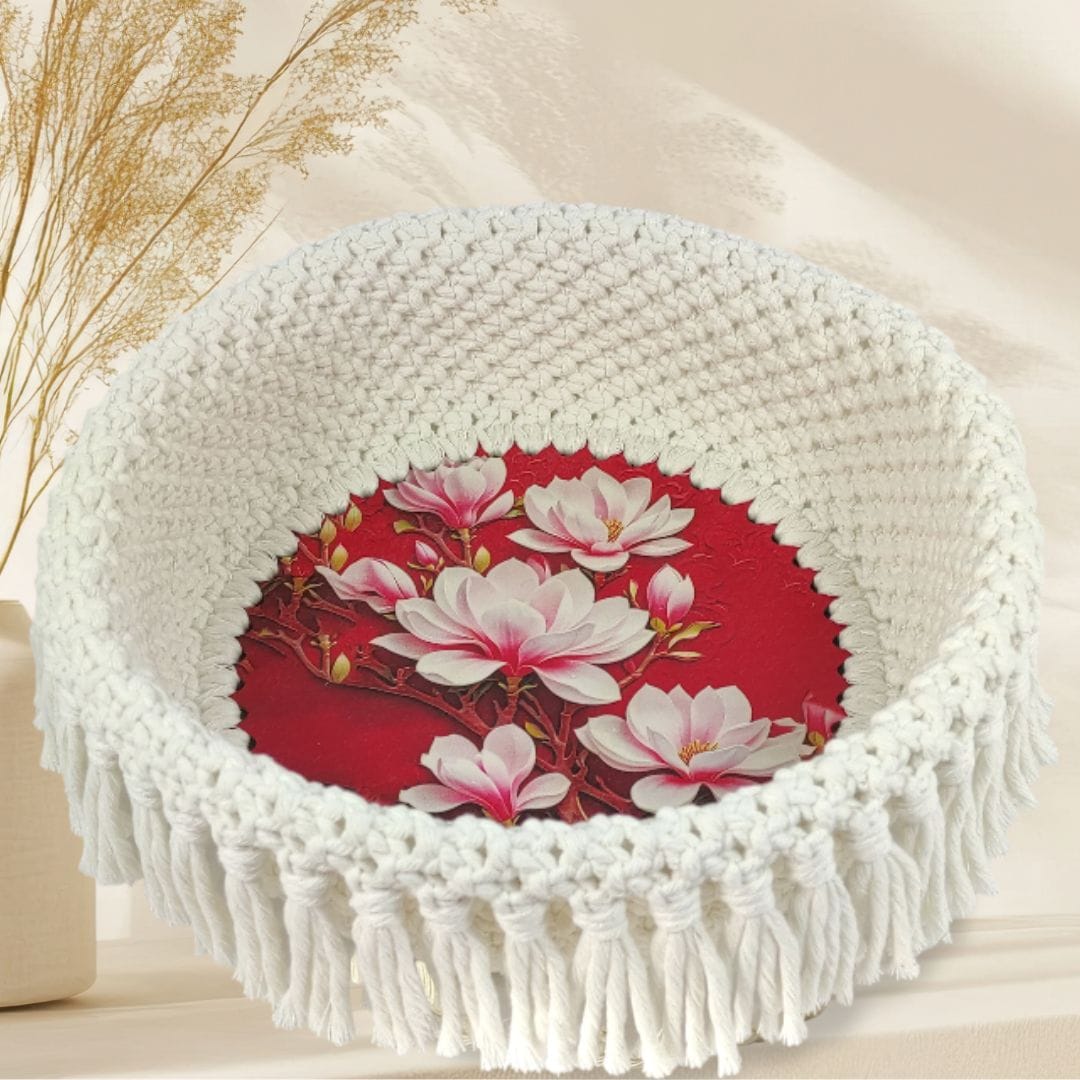 Le panier en macramé bois et corde est conçu pour durer : diamètre extérieur ≈ 26 cm, diamètre intérieur ≈ 23 cm, hauteur ≈ 9 cm. La corde choisi — coton peigné 3 mm — apporte douceur et résistance, tandis que le fond en bois garantit tenue et esthétique.