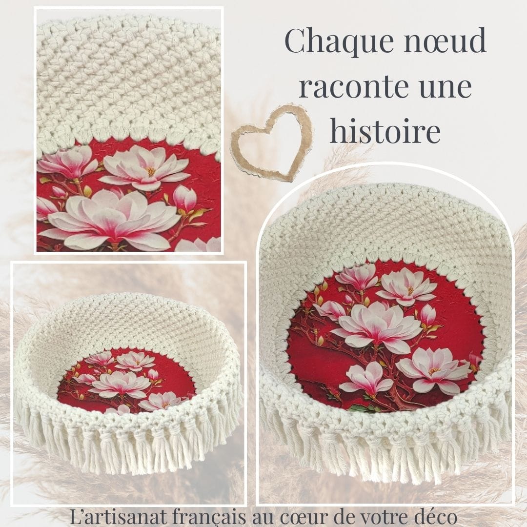 Corbeille en macramé écru artisanale faite à la main en France, panier déco boho chic en bois recyclé au motif floral rose et corde de 3 mm. Format idéal pour rangement entrée, salon, cadeau original. Livraison France & international.