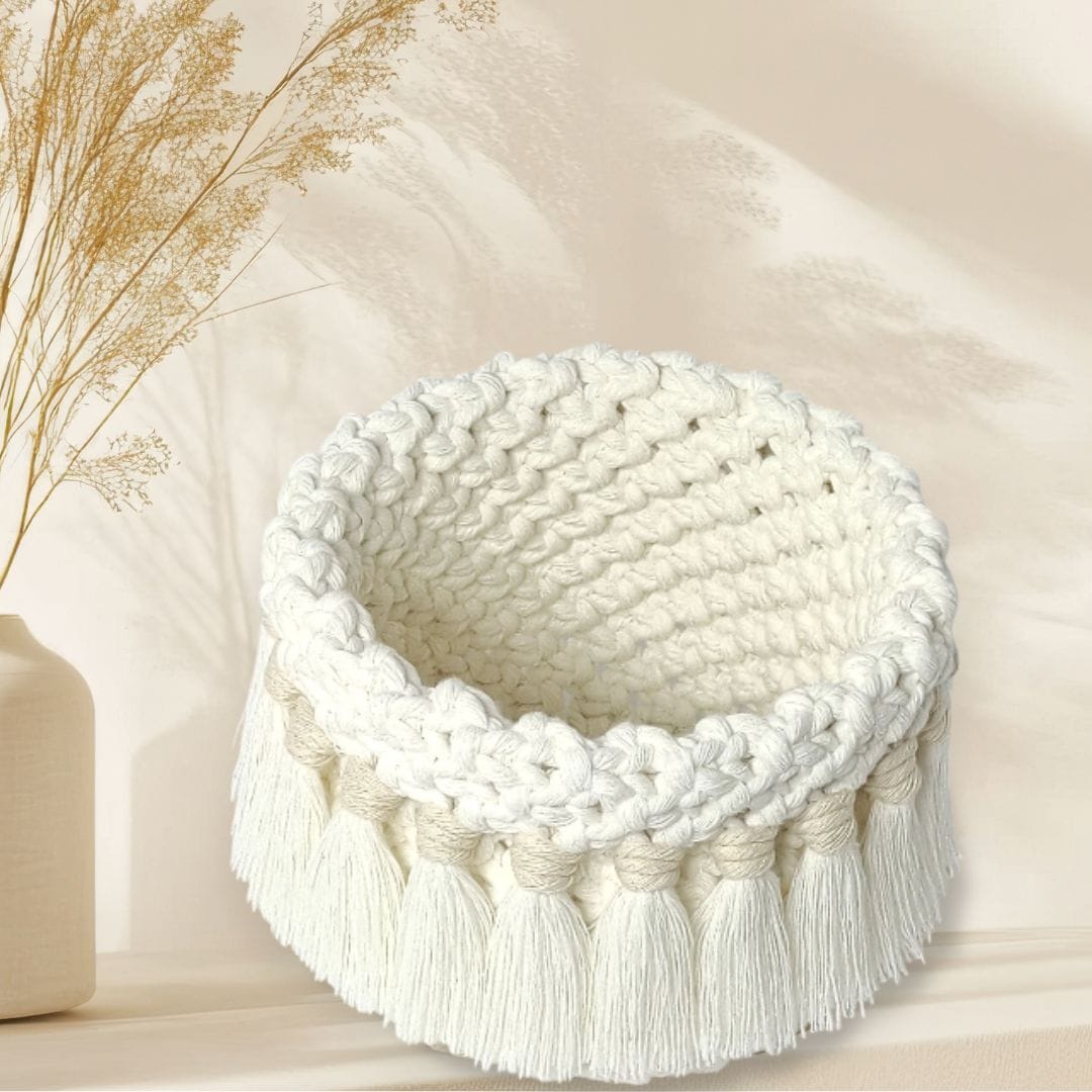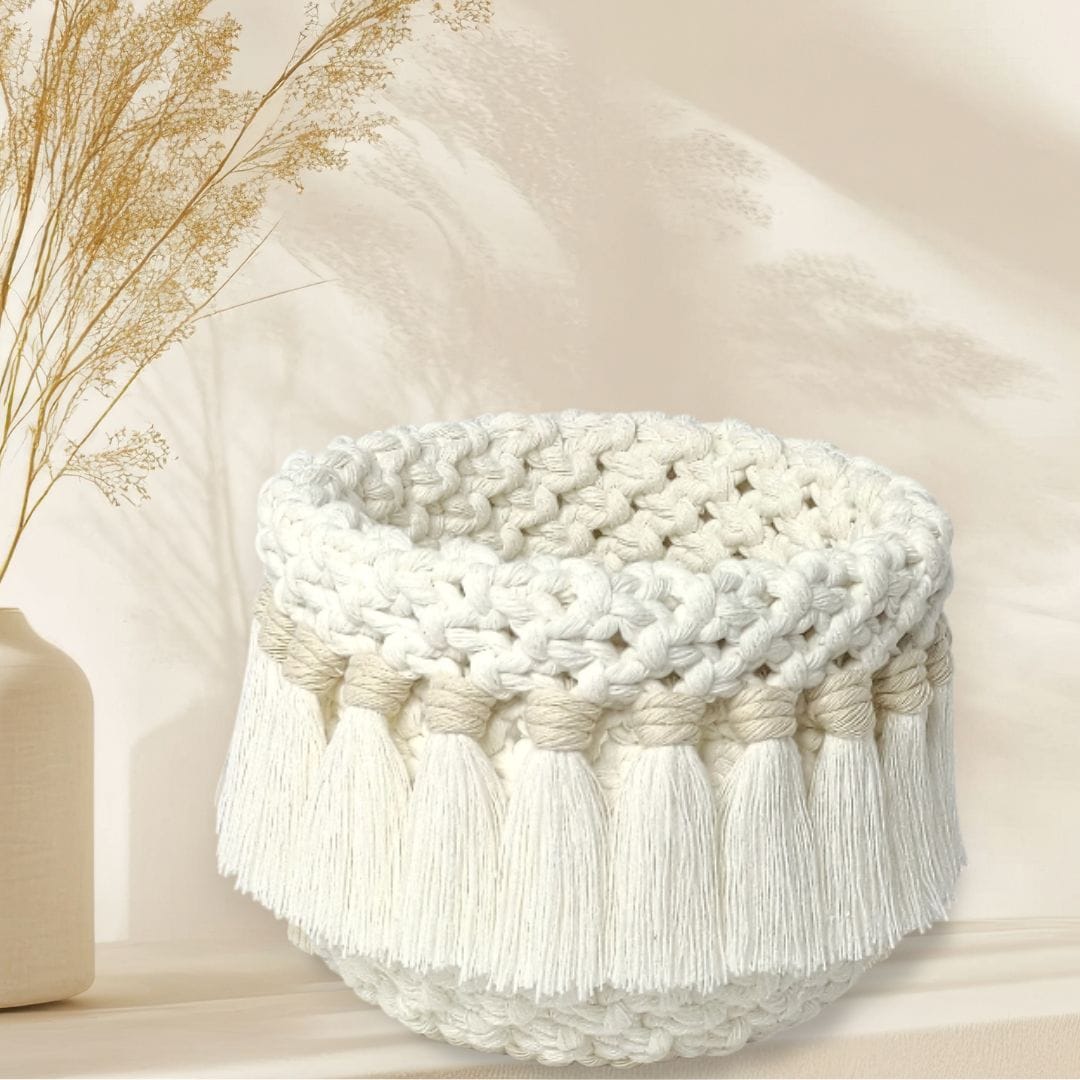 Corbeille macramé faite main, tissée avec soin dans mon atelier, apporte immédiatement une ambiance douce et authentique à votre maison. Je bois à l’artisanat depuis toujours, et chaque panier macramé fait main que je crée raconte une histoire : celle du coton peigné, des franges délicates, du choix d’un style bohème chic mélangé à une fonctionnalité pratique.