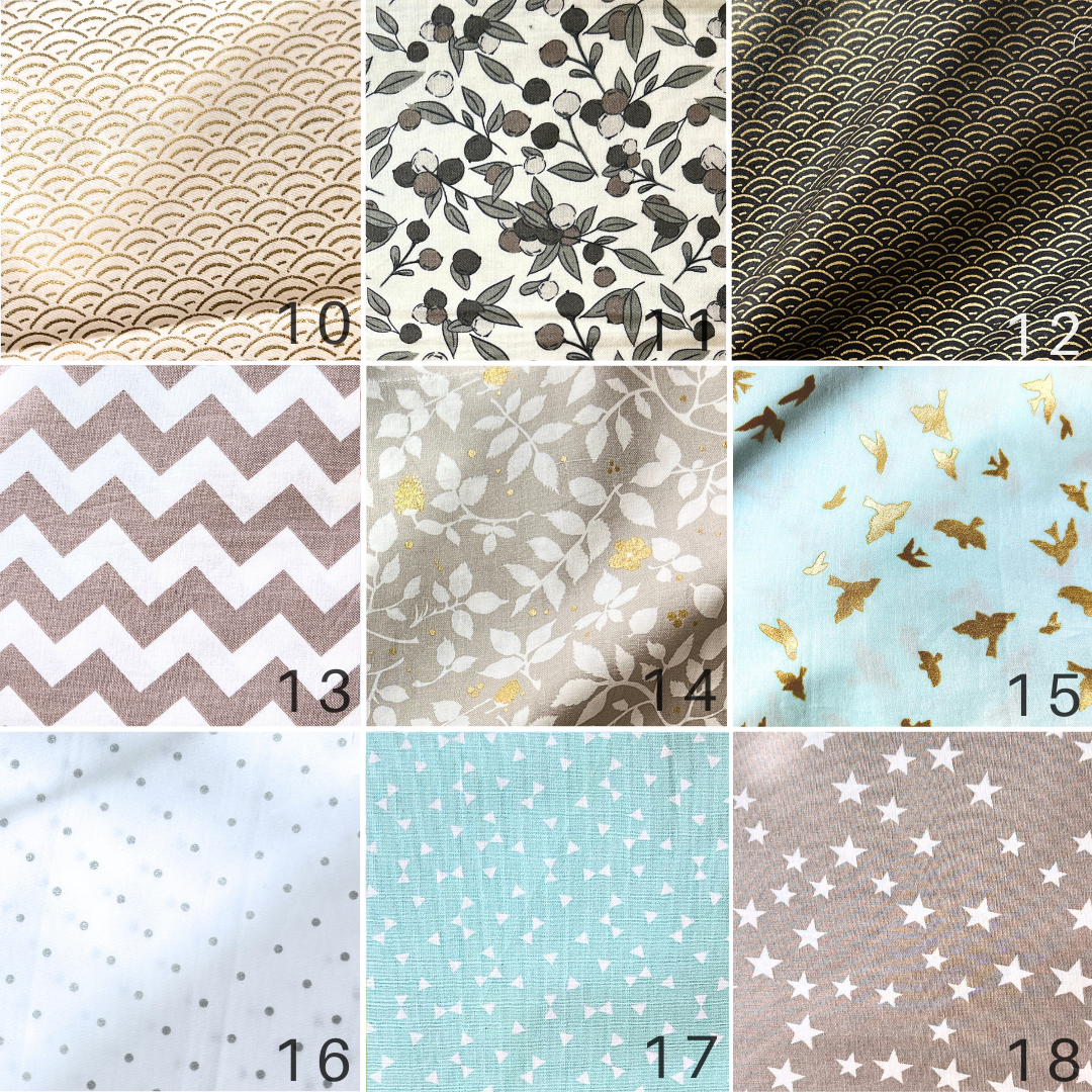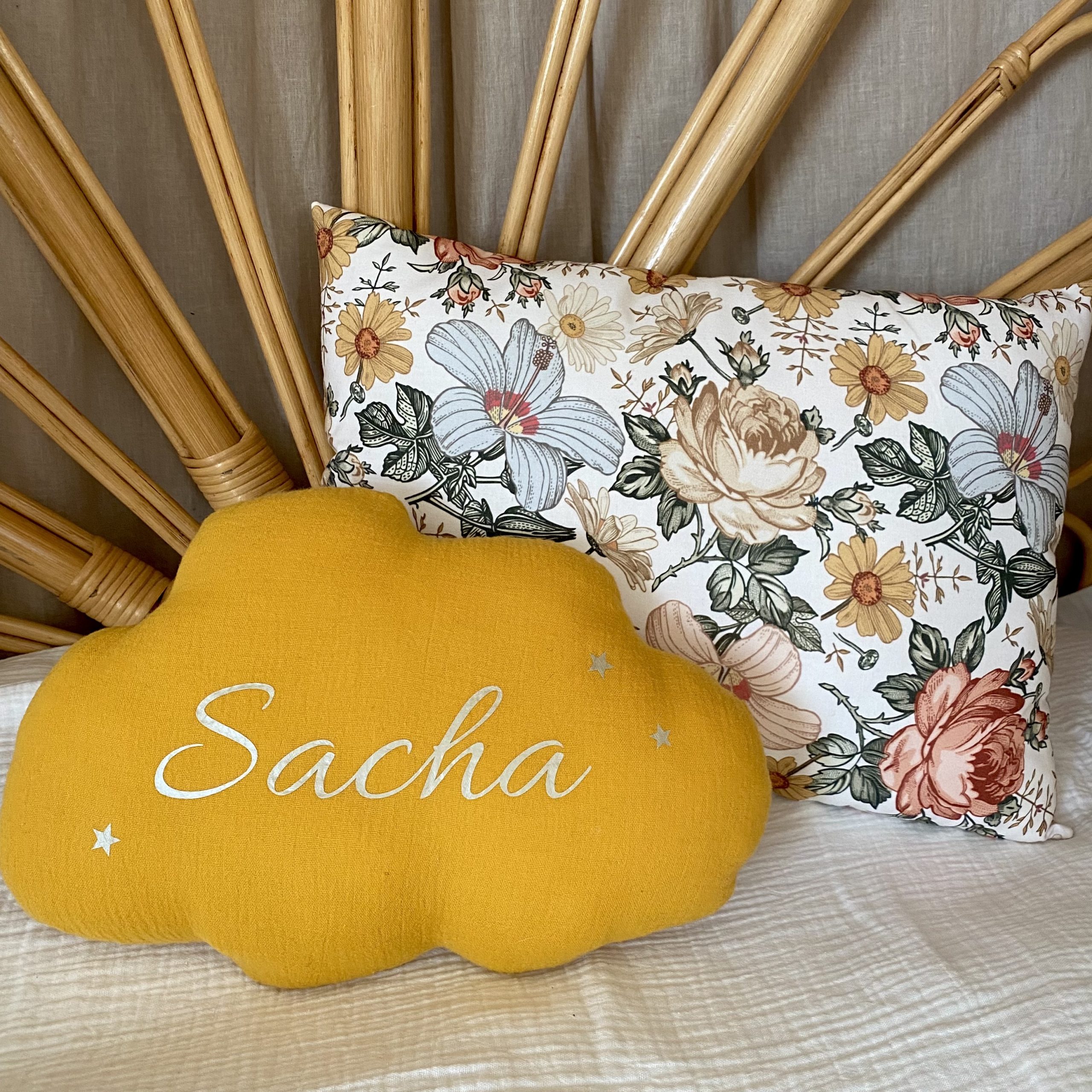 - Composition : Face du coussin 100% coton à motifs, dos 100% coton uni assorti. Rembourrage ouate 100% polyester. Prénom en flex thermocollant.
