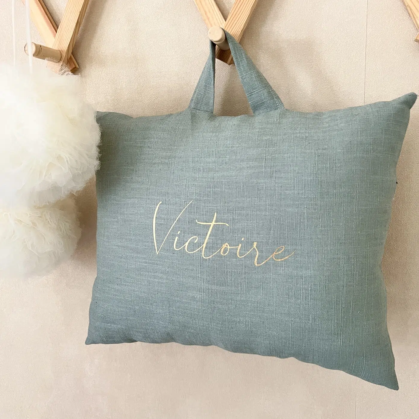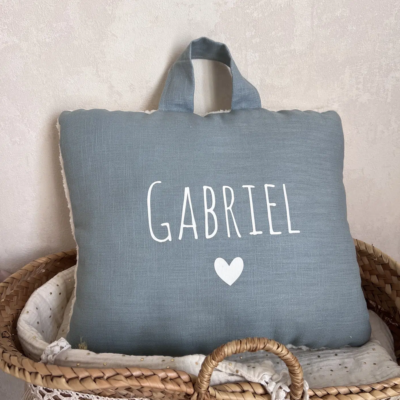 - Coussin sieste en lin rectangulaire avec anse, idéale pour l’emmener partout! Il est disponible avec verso en lin ou en sherpa pour plus de douceur.