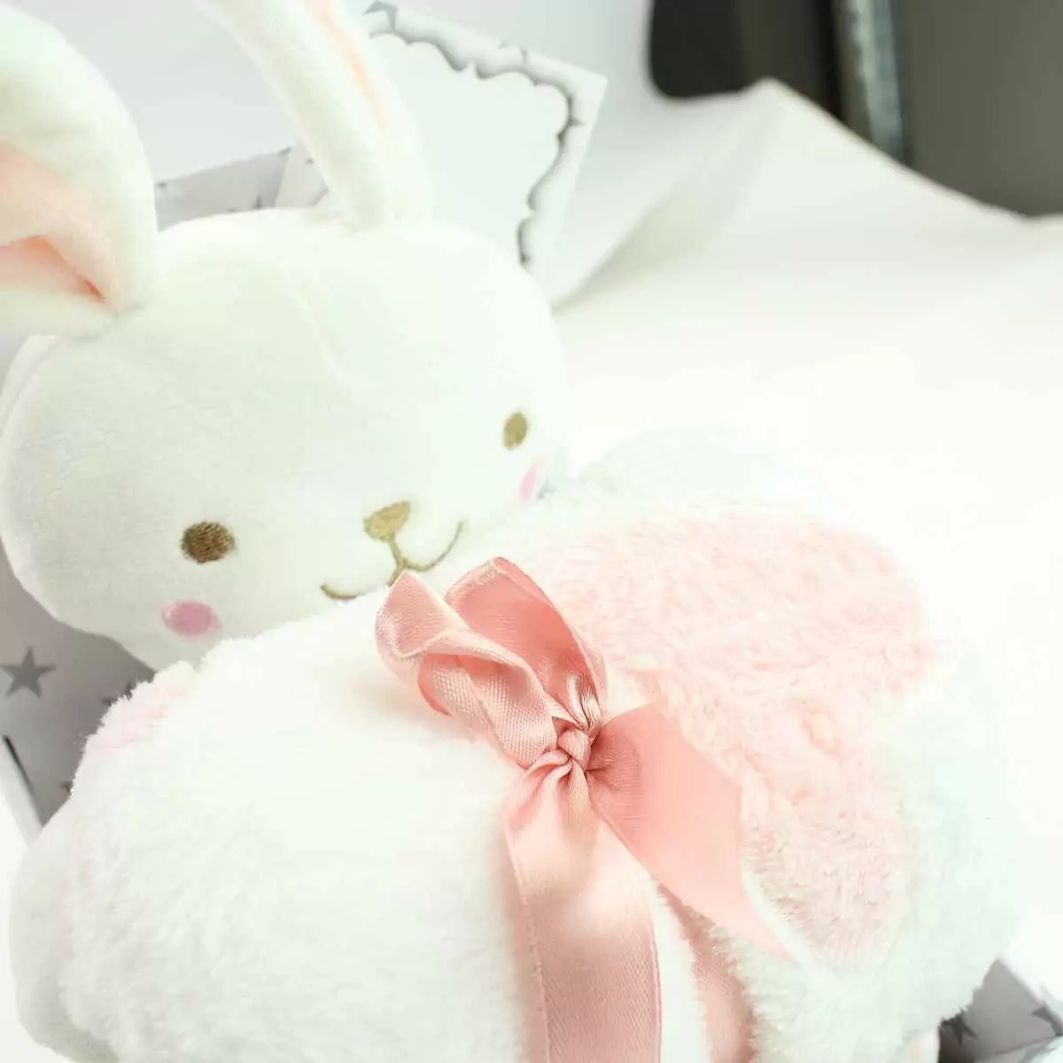 Offrez à votre bébé un duo de tendresse avec notre coffret couverture et peluche assorties.