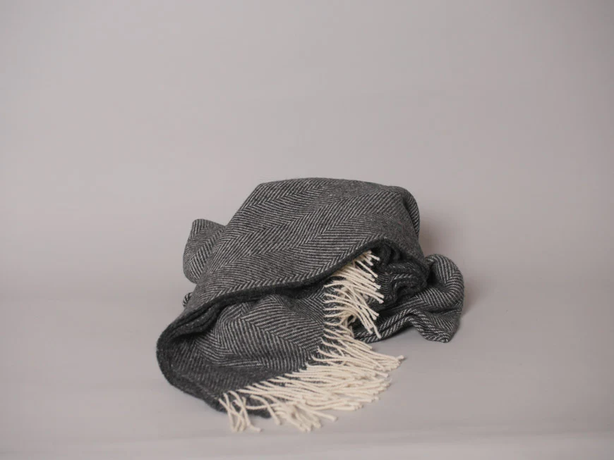 Produit : Nouveau chez Storie, de magnifiques couvertures sont fabriquées à partir de surplus de fils de laine fine restants des collections saisonnières d’une de nos filatures de laine irlandaises préférées.