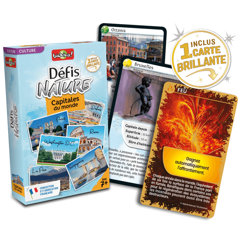 Explorez la planète avec Défis Nature – Capitales du Monde de Bioviva !Dès 7 ans, 2 à 6 joueurs s’affrontent pour comparer les grandes capitales selon leurs caractéristiques : habitants, superficie, altitude… Un jeu rapide et instructif pour enrichir sa culture tout en s’amusant.Chaque carte dévoile des infos passionnantes et de superbes photos des plus belles villes du monde. Fabriqué en France et éco-conçu, ce jeu allie apprentissage, fun et respect de la planète. Un indispensable pour les curieux et les voyageurs en herbe !