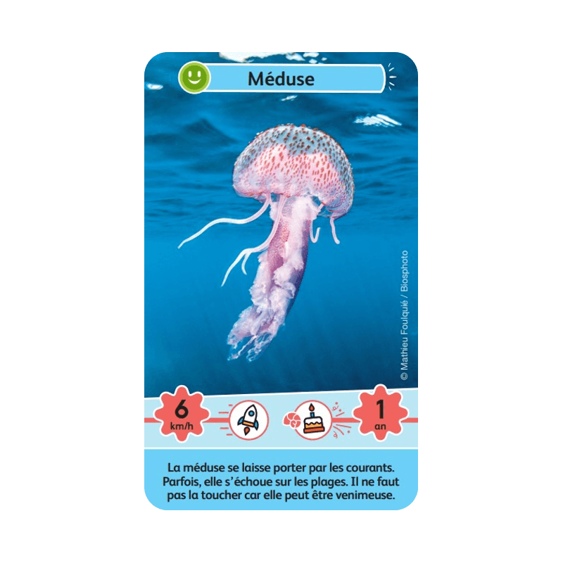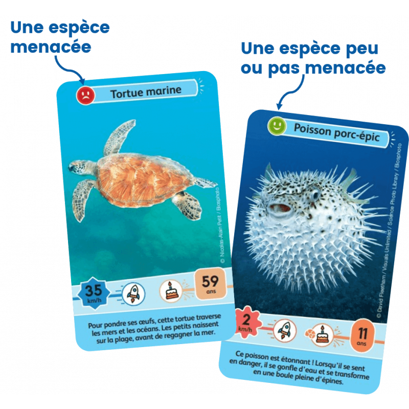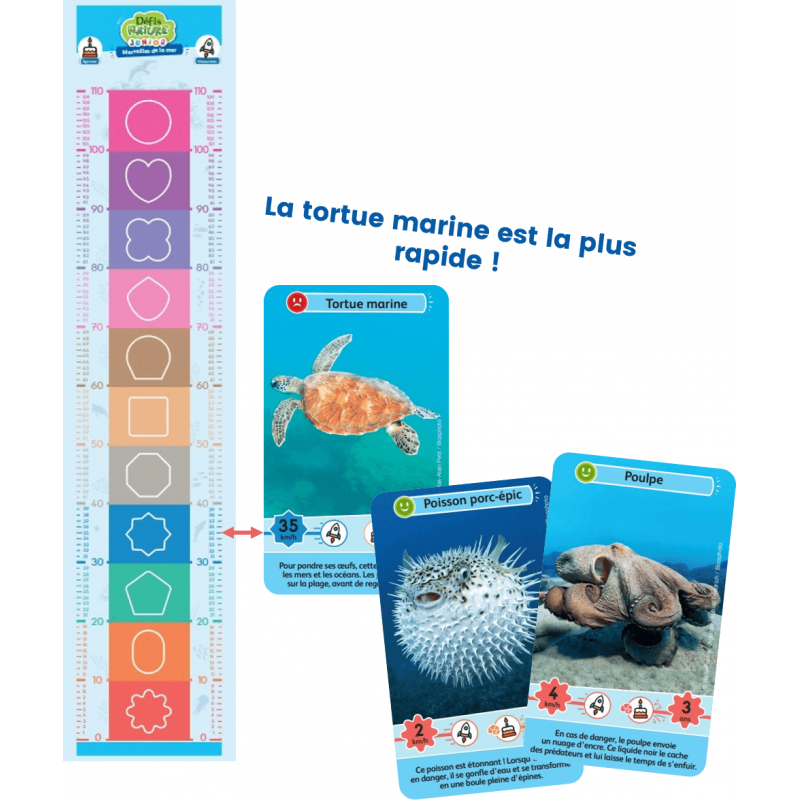 Le principe de Défis Nature Junior – Merveilles de la mer est simple : les enfants parient sur la vitesse ou la longévité des animaux. Celui qui possède la plus forte caractéristique remporte les cartes des autres joueurs. Le joueur ayant collectionné le plus de cartes à la fin de la partie, l’emporte.