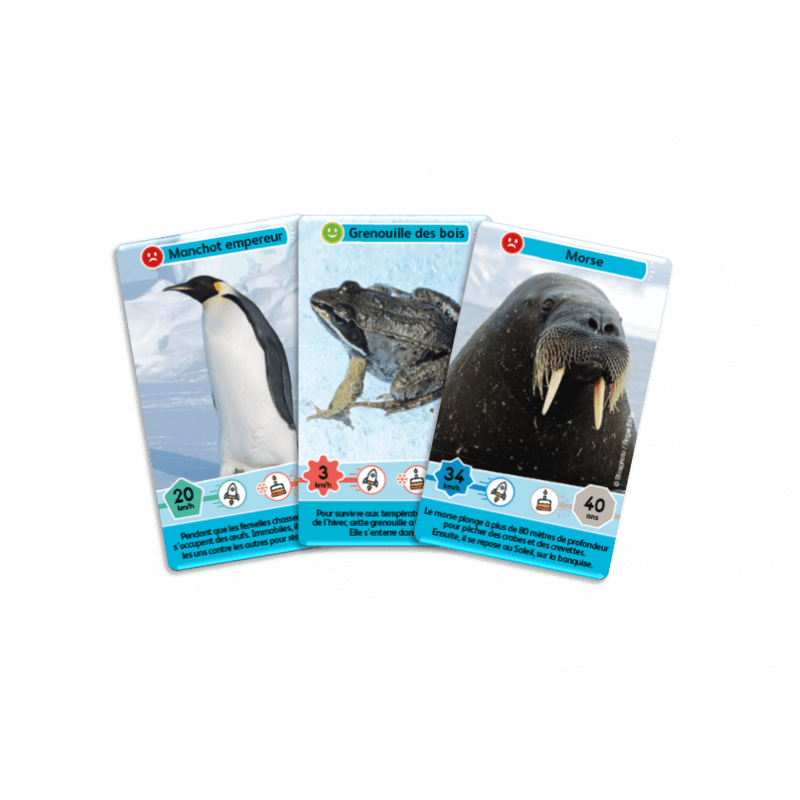 Le principe de Défis Nature Junior – Royaumes du froid est simple : les enfants, à partir de 5 ans, parient sur la vitesse ou la longévité des animaux. Celui qui possède la plus forte caractéristique remporte les cartes des autres joueurs. Le joueur ayant collectionné le plus de cartes à la fin de la partie, l’emporte.