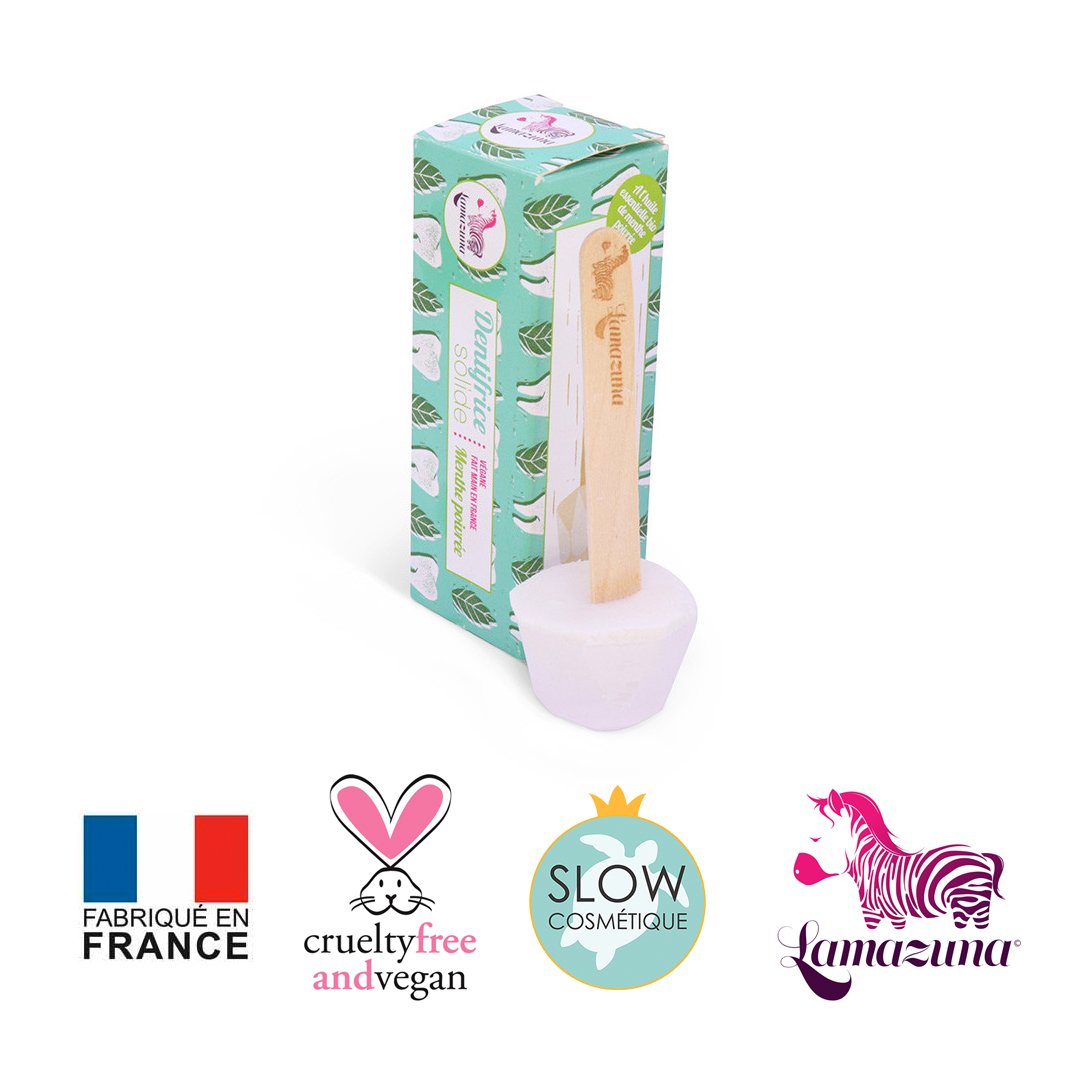 Non testé sur les animaux, le dentifrice solide Lamazuna est 100% vegan . Labellisé Cruelty Free par la PETA et a obtenu la mention Slow Cosmétique.