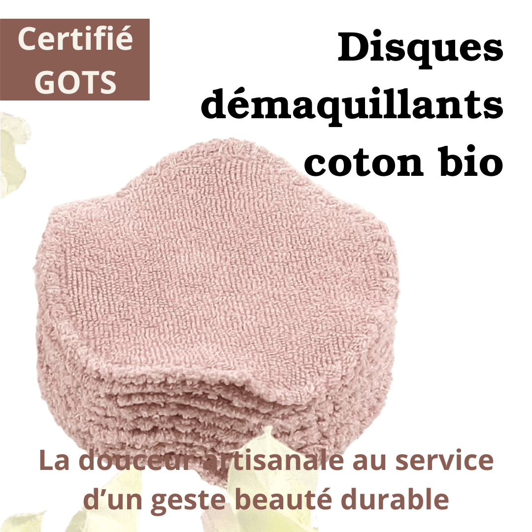 Disques démaquillants en coton bio réutilisables, micro-éponge douce certifiée GOTS (100 % coton), lavables jusqu’à 60 °C, zéro déchet, fabriqués artisanalement en France.