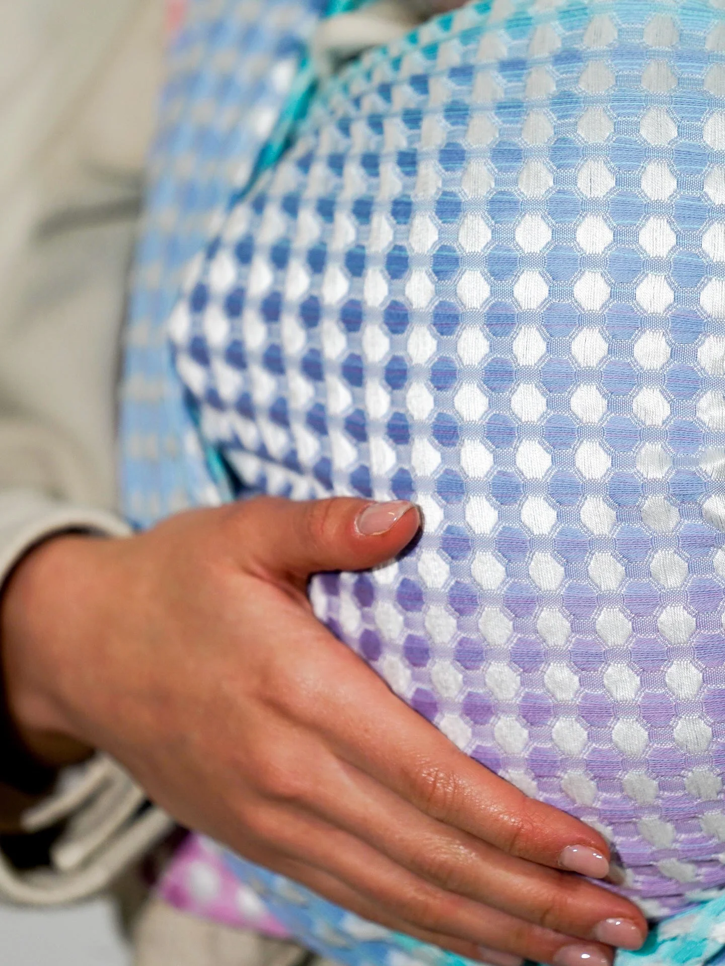 Die erhöhten Waben schmiegen sich sanft an dein Baby, während die weich eingebetteten Zwischenräume ein Gefühl von purer Geborgenheit schenken. Marie ist mehr als ein Tragetuch – sie ist ein Kokon aus Wärme, Nähe und Sicherheit.