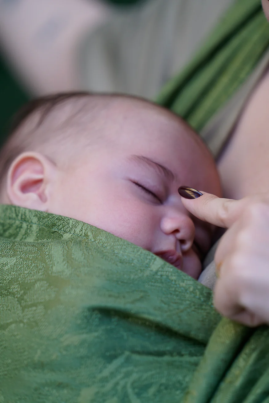 Die Farbe, dieses besondere Moosgrün, ist warm, beruhigend und unglaublich erdend. Es lädt dich ein, anzukommen. Es umarmt dich, bevor du überhaupt gebunden hast. Es schenkt dir das Gefühl: Ich bin sicher. Mein Baby ist sicher. Wir sind genau hier, wo wir sein sollen. Das natürlichste der Welt.