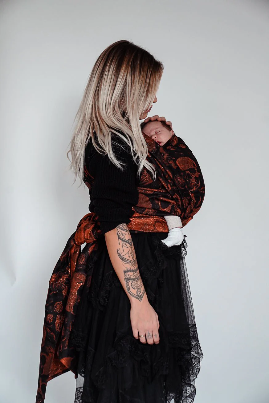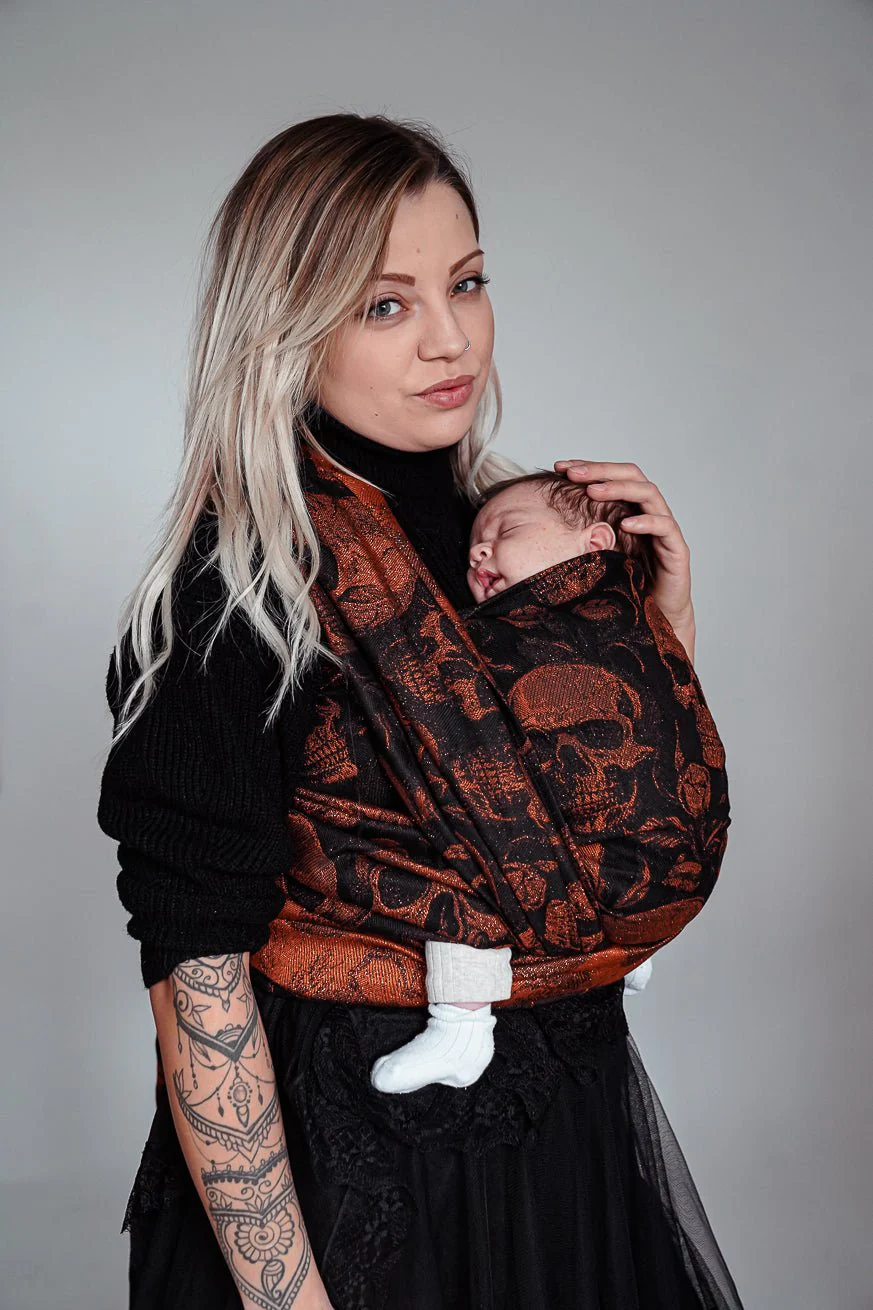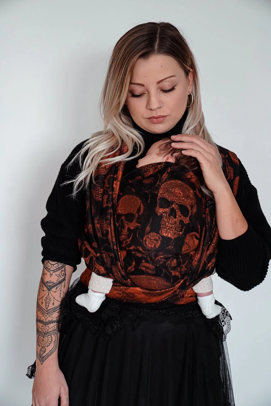 Das KOKADI Tragetuch Skulls x Florian ist mehr als ein Stück Stoff – es ist ein Gefühl von Freiheit, Stärke und Nähe in seiner schönsten Form. Schwarze Tiefe, durchzogen von kupferfarben schimmernden Totenköpfen, die im Licht lebendig wirken – wie flackernde Funken auf dunklem Samt. Skulls x Florian ist keine Mode, sondern Ausdruck. Ausdruck deiner Persönlichkeit, deiner Liebe, deines Andersseins.