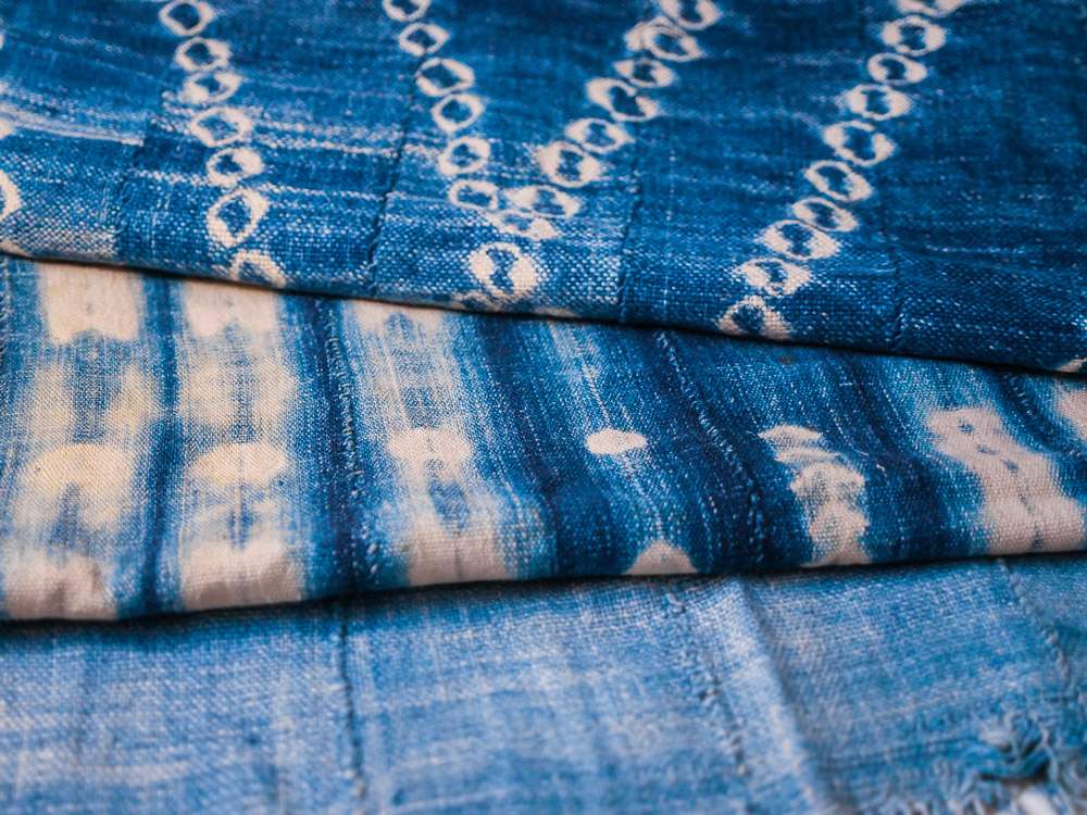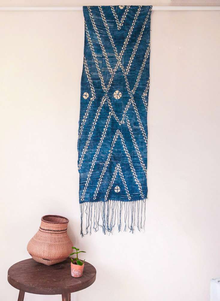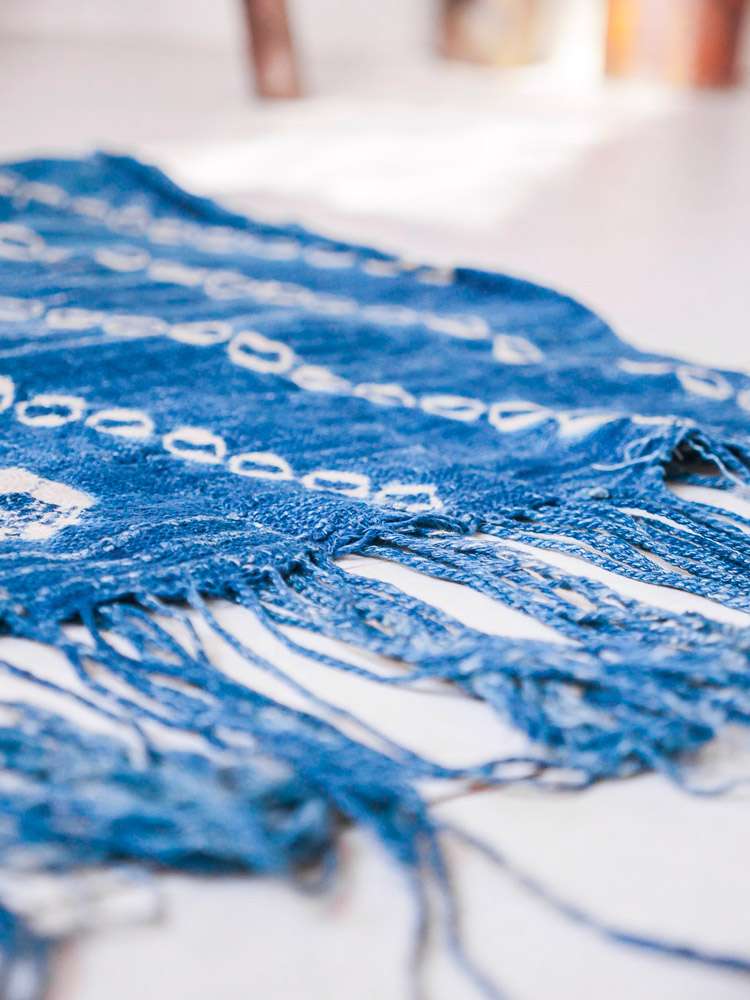 Sur notre site de vente en ligne, vous trouverez de longues écharpes ainsi que des tentures murales en coton tissées et teintées à la main avec ce pigment bleu naturel et magique qui rend chaque pièce unique.