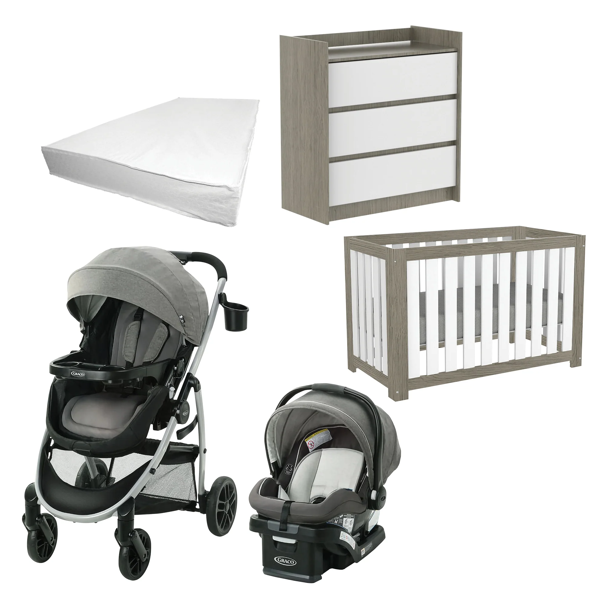 Préparez l’arrivée de votre bébé avec ce kit complet de 5 morceaux, incluant le système de voyage Graco Modes, un lit pour bébé Boobeyeh, une table à langer Boobeyeh, une commode assortie, et un matelas pour bébé fabriqué au Canada.