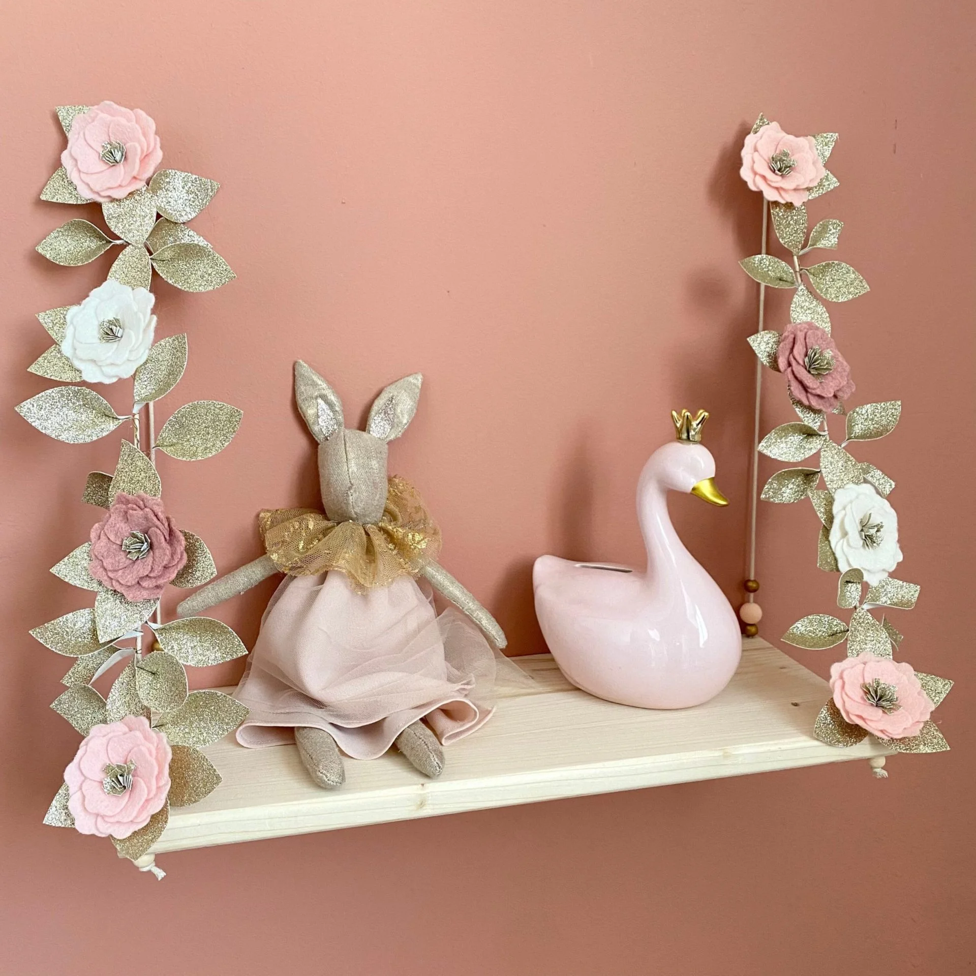 - Jolie etagère balançoire avec guirlandes de fleurs et perles assorties dans les tons de nude, ivoire, vieux rose et or. La décoration poétique idéale dans une chambre d’enfant pour créer une ambiance « forêt enchantée ».