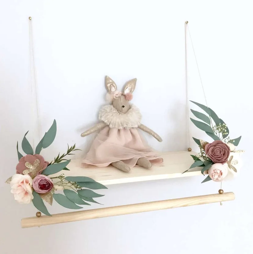 - Jolie étagère balançoire fleurie dans les tons vieux rose et rose pâle avec feuillage imitant l’eucalyptus, la décoration poétique parfaite pour une chambre d’enfant.