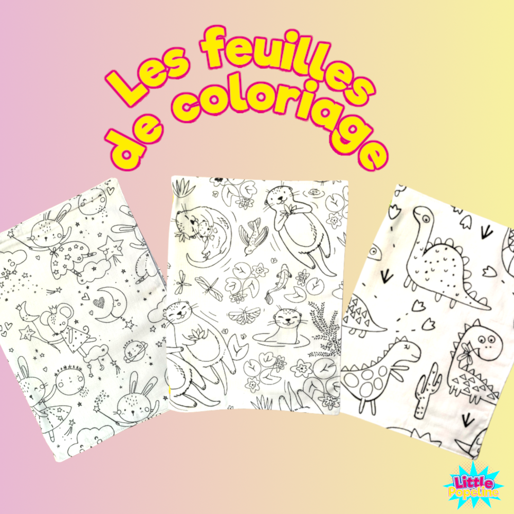 La feuille de coloriage : Se clipse sur la pochette de coloriage Little Popeline grâce à ses boutons pression Mesure 38cm x 25 cm (25cm x 19cm une fois pliée en 2) Se lave en machine à 30 degrés afin de recolorier à l’envie