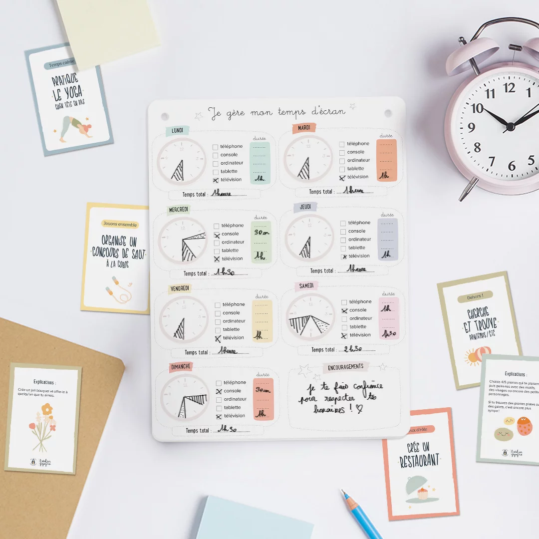 Aidez vos enfants à mieux gérer leurs usages numériques grâce au coffret Je gère mon temps d’écran de L’Atelier Gigogne. Conçu comme un outil éducatif et ludique, il accompagne les familles dans l’instauration de règles claires autour des écrans, tout en favorisant l’autonomie et la responsabilisation.
