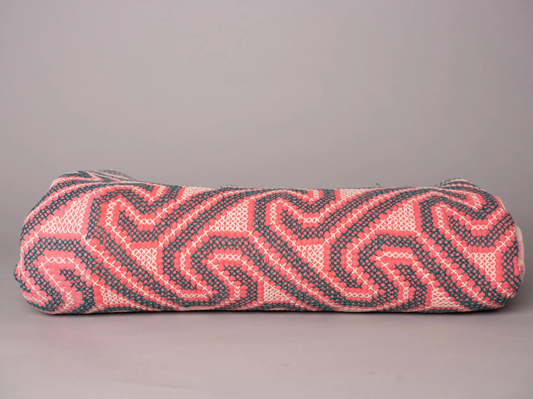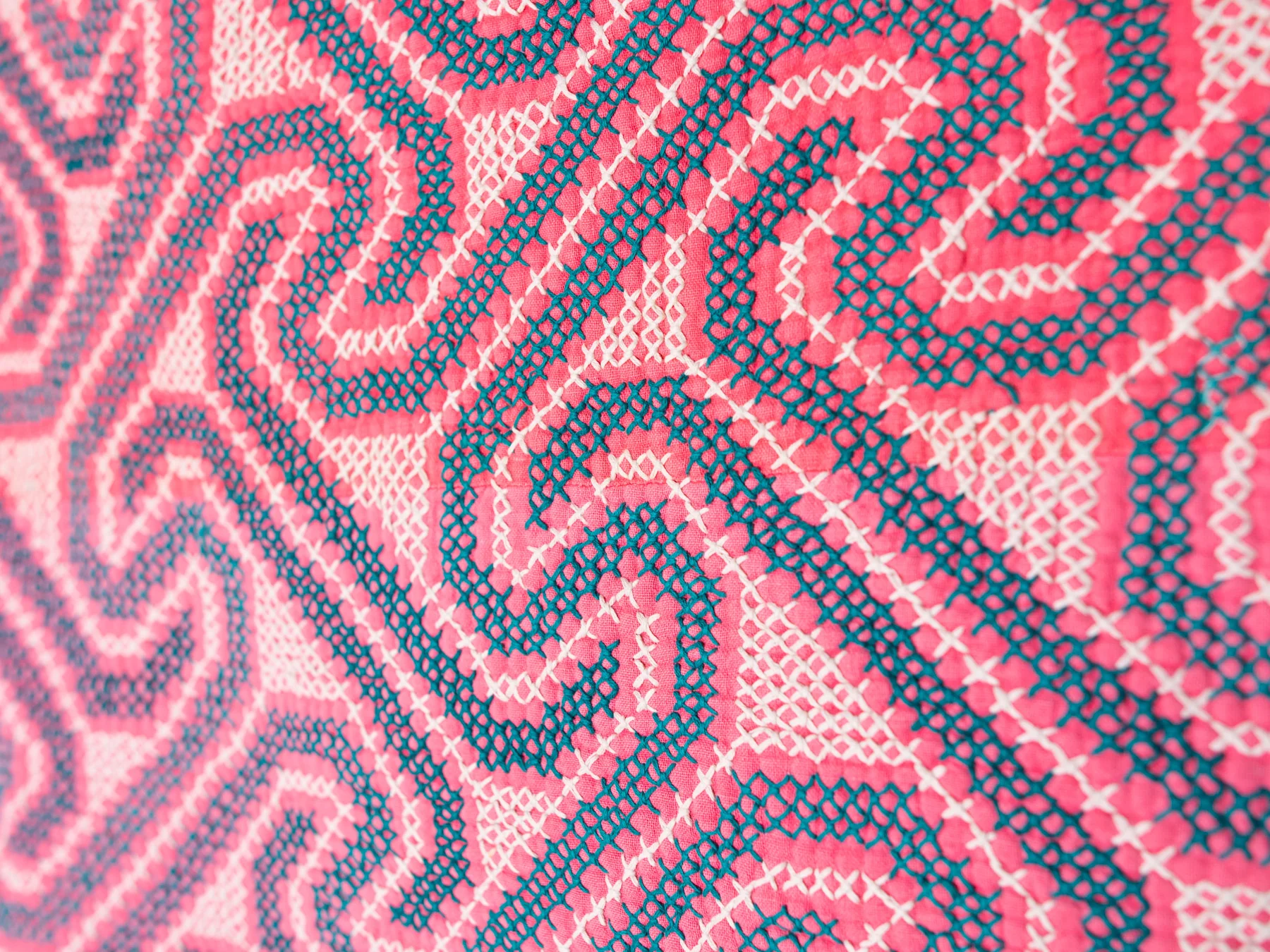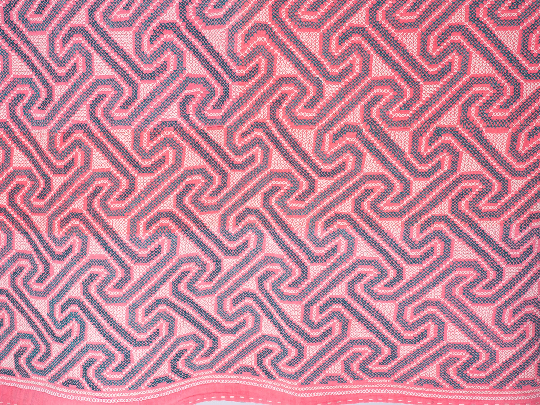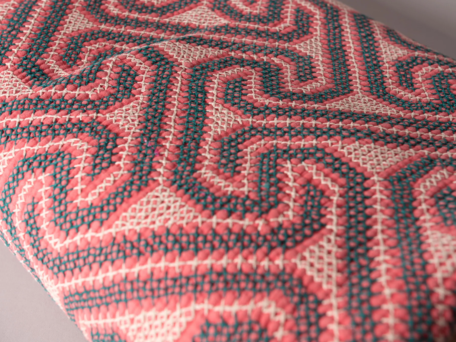 Ce jétée au point de croix provient de la région du Bengale, au Bangladesh et en Inde. Il est fabriqué à partir de couches de coton recyclé, brodées au point de croix de motifs géométriques complexes.