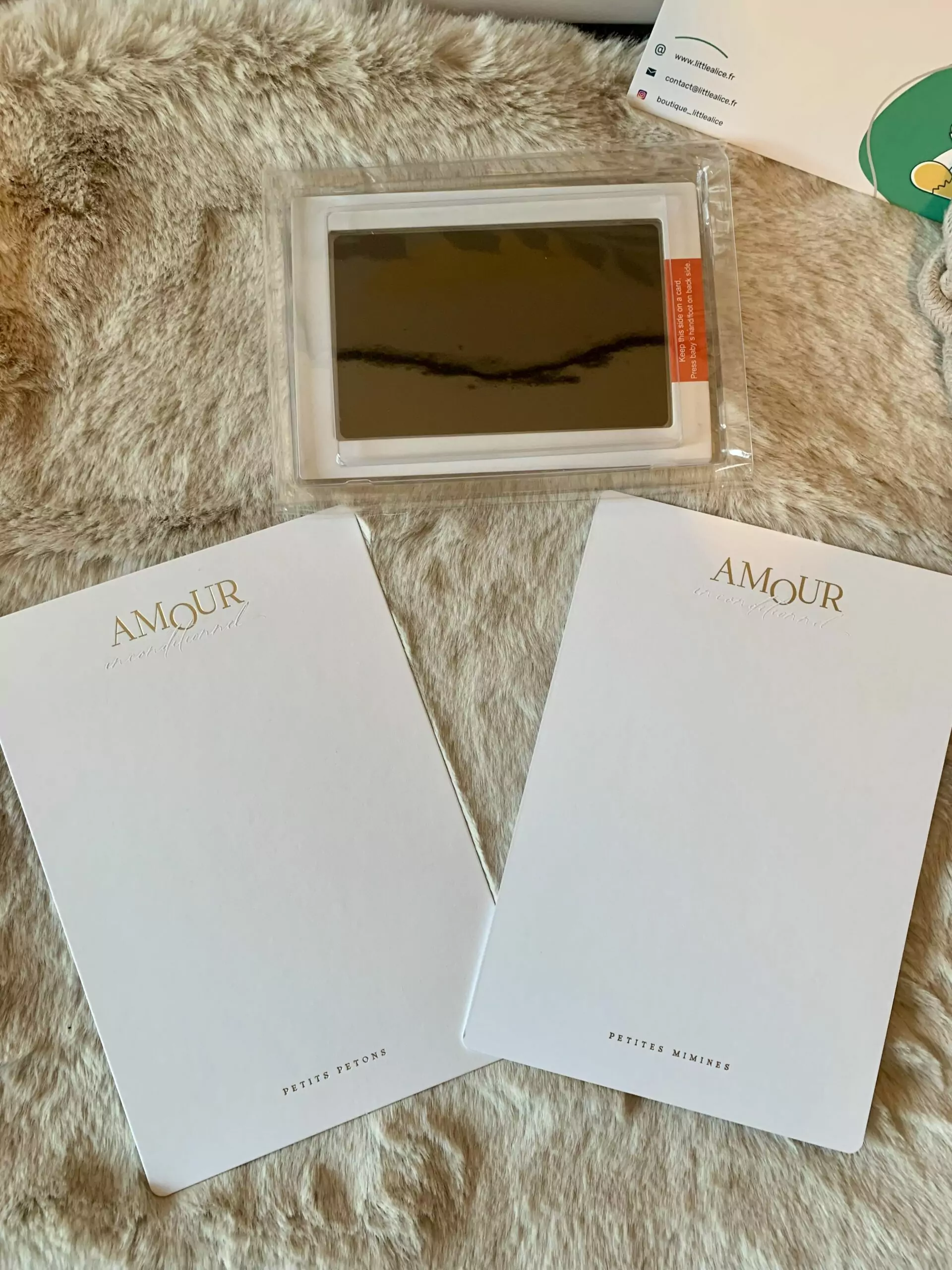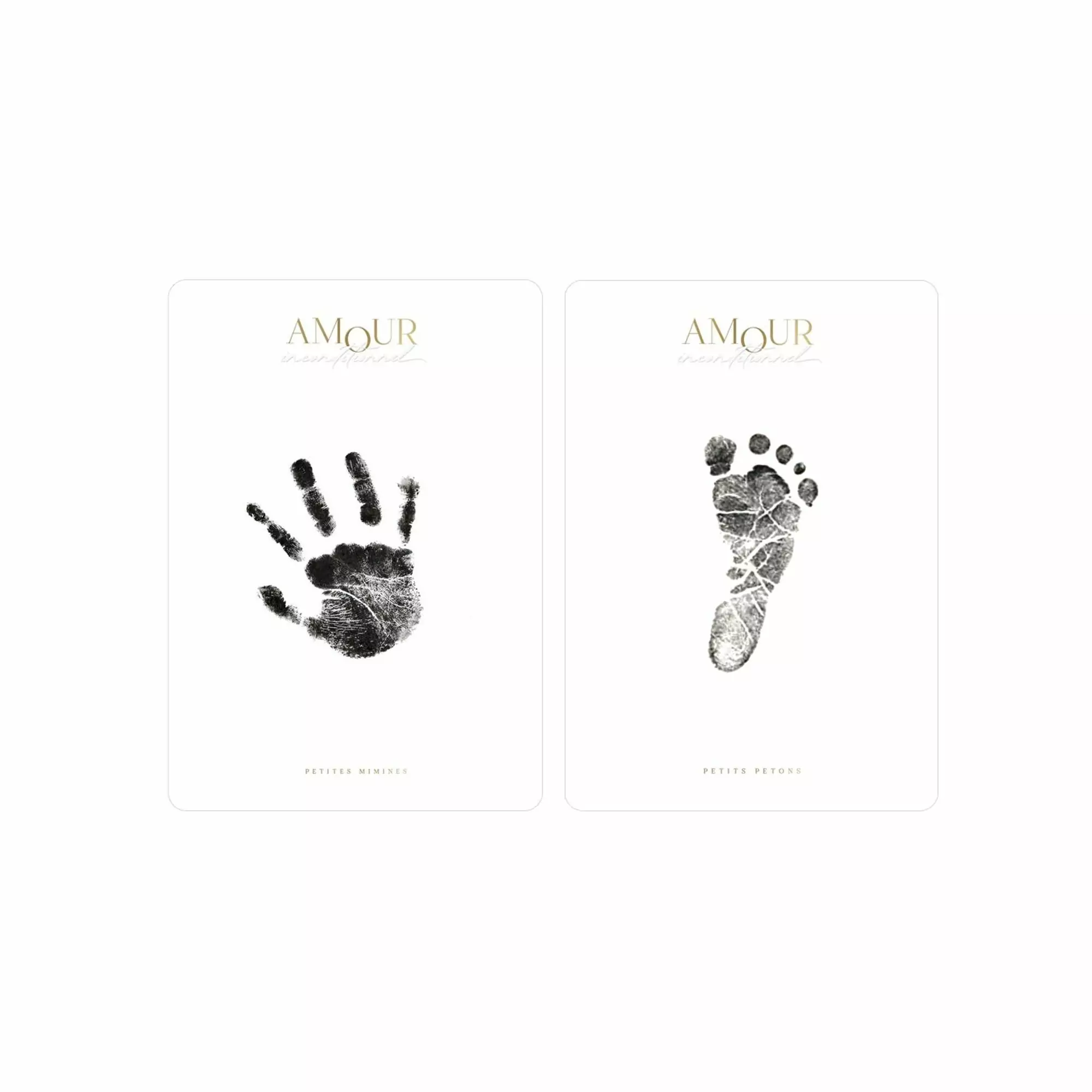Immortalisez les premiers instants de votre bébé avec ce joli kit d’empreintes, conçu pour capturer chaque petit détail en toute sécurité. Il comprend 2 cartes au format A5, au design raffiné sublimé par une dorure à chaud, ainsi qu’un encreur innovant « sans contact ». Grâce à cette technologie, la peau délicate de votre enfant ne touche jamais l’encre, tout en offrant une empreinte nette et précise.