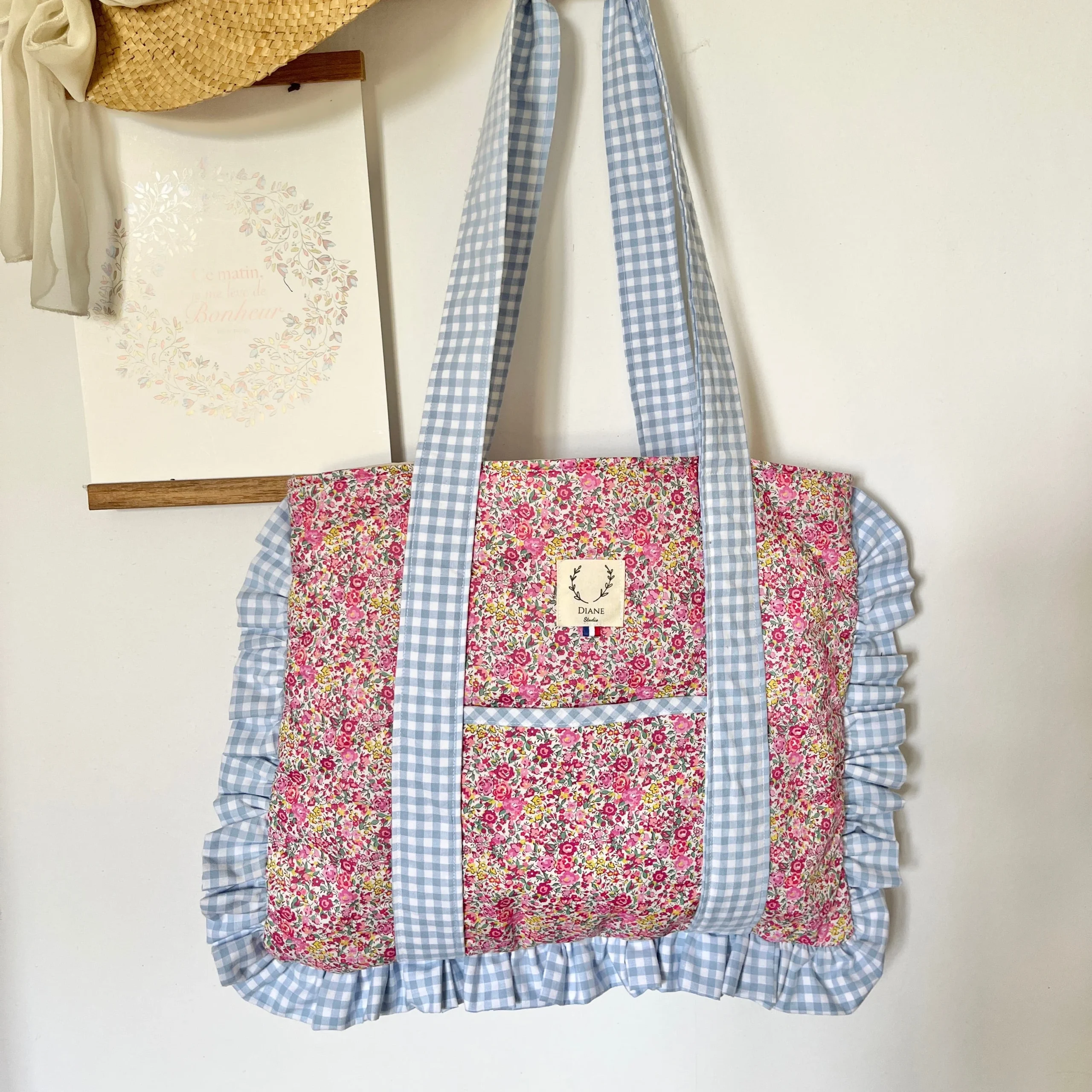 Le grand tote bag Agnès vichy bleu et Liberty Emma hibicus