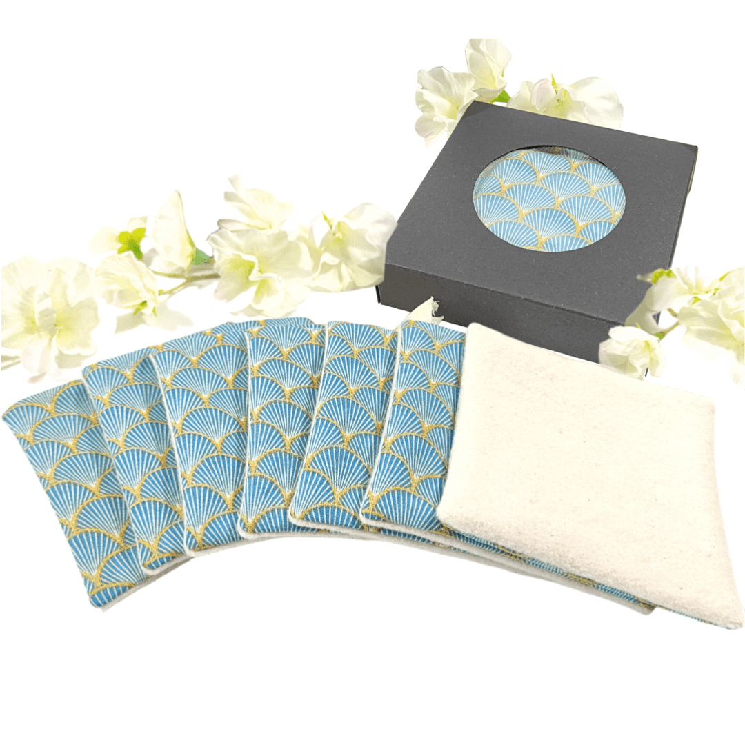 Chaque lingette démaquillante lavable en coton bio est façonnée avec soin dans mon atelier. Les motifs éventail bleus sont un hommage à l’art textile, un clin d’œil à la délicatesse et à la féminité. Leur texture moelleuse offre une sensation unique au contact de la peau, transformant le démaquillage en un moment de détente.