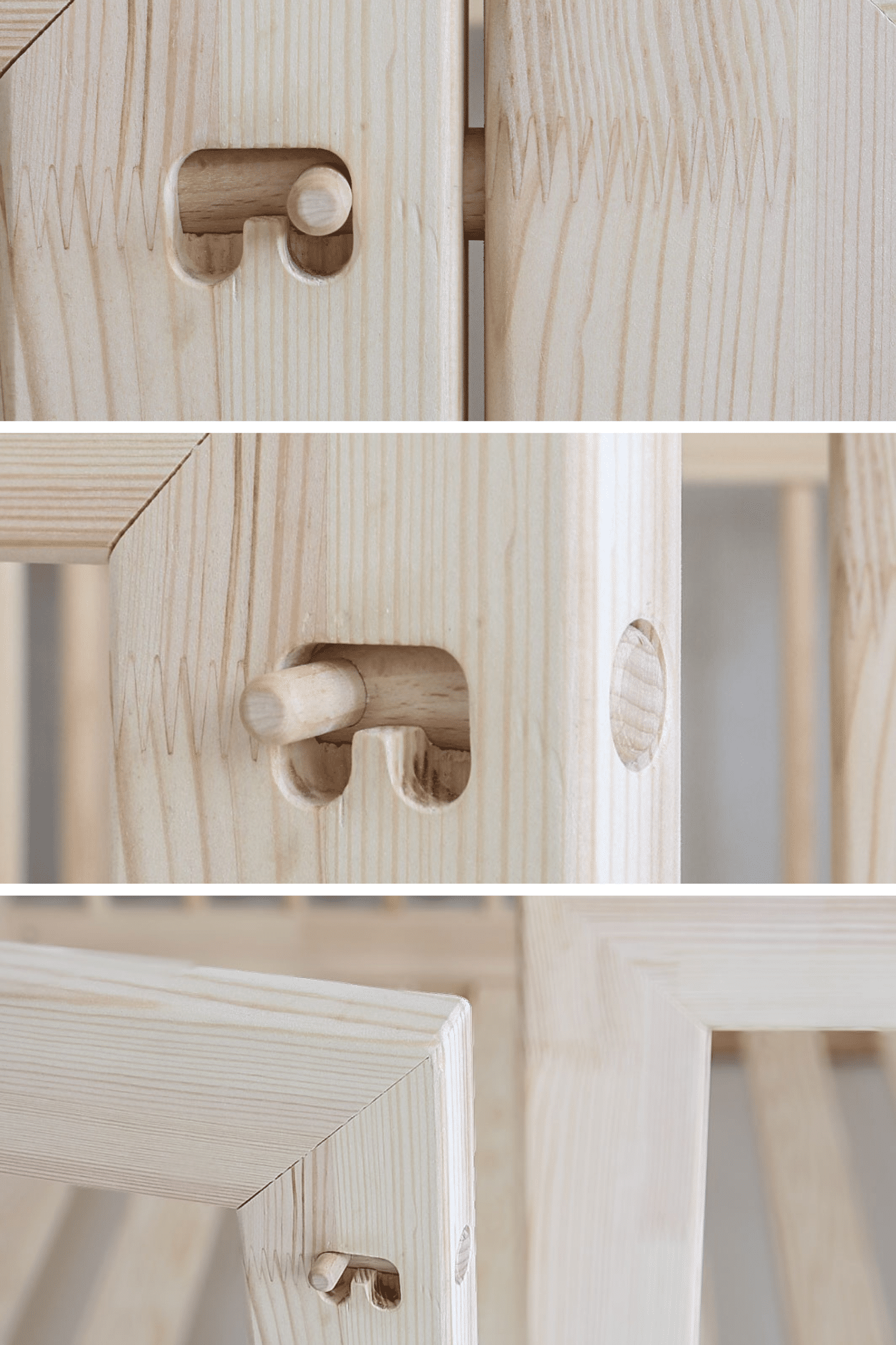 Avec sa porte équipée de charnières en laiton et une fermeture en chevilles de bois de hêtre, ce lit offre une solution de sécurité pensée pour les besoins des enfants. La structure basse du lit réduit les risques de chutes nocturnes, tandis que la porte offre une barrière supplémentaire qui peut être facilement maniée par de petites mains, permettant aux enfants de gérer leur propre espace de manière sûre.