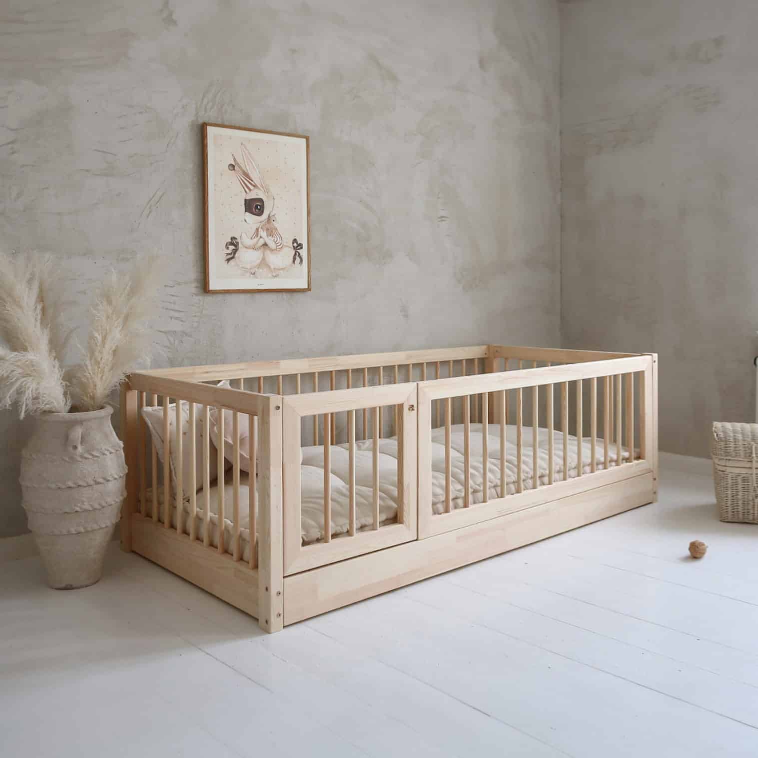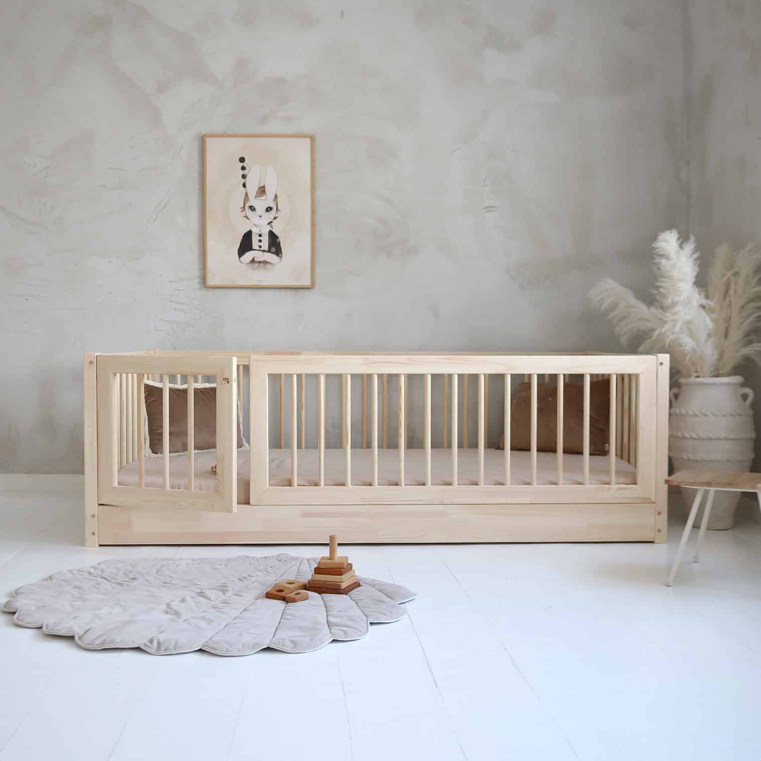 Le lit au sol bébé Helsinki, mesurant 200 x 100 cm, est spécialement conçu pour favoriser l’autonomie des plus jeunes. Doté d’une porte pratique de 53,5 cm avec des charnières cylindriques en laiton, ce lit permet aux enfants d’entrer et de sortir facilement, encourageant leur indépendance tout en assurant un espace de sommeil sécurisé et adapté à leur taille.