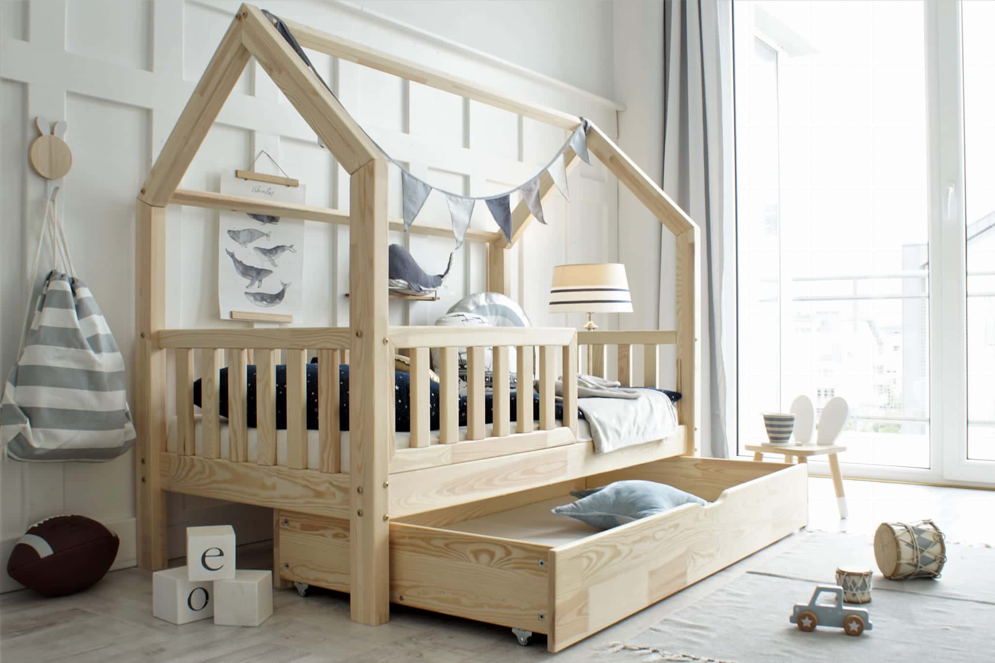 Le lit cabane Oslo avec tiroir combine la chaleur du design scandinave avec la fonctionnalité d’un espace de jeu. Fabriqué en bois de pin naturel de haute qualité, ce lit assure un sommeil paisible et offre un coin de détente ludique pour votre enfant.