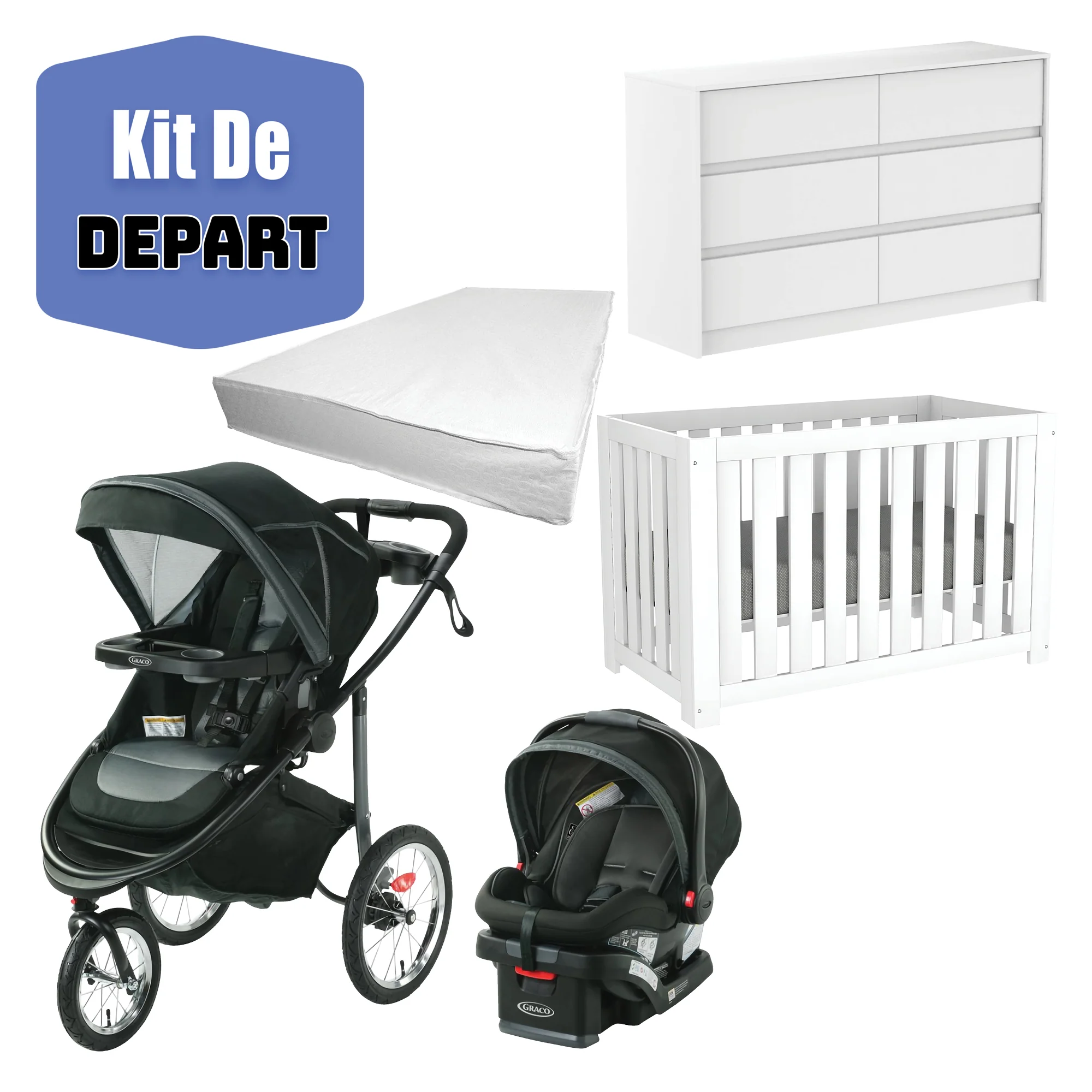 Ensemble Complet pour Chambre de Bébé : Lit Convertible Blanc fabriqué au Québec, Commode Double fabriquée au Québec, Matelas pour Bébé fabriqué au Canada, Poussette et Siège d’Auto Graco Modes Jogger – Felix