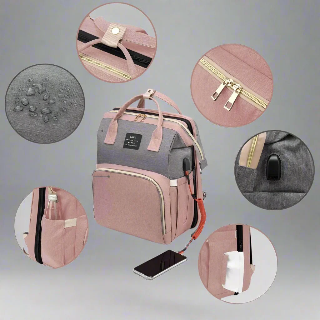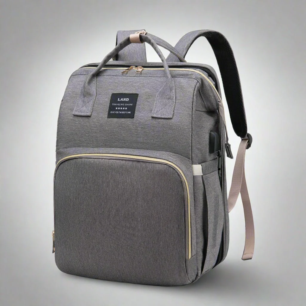 Combinez un sac à dos, un sac a langer, un lit de voyage bebe, un espace de changement de couche.
