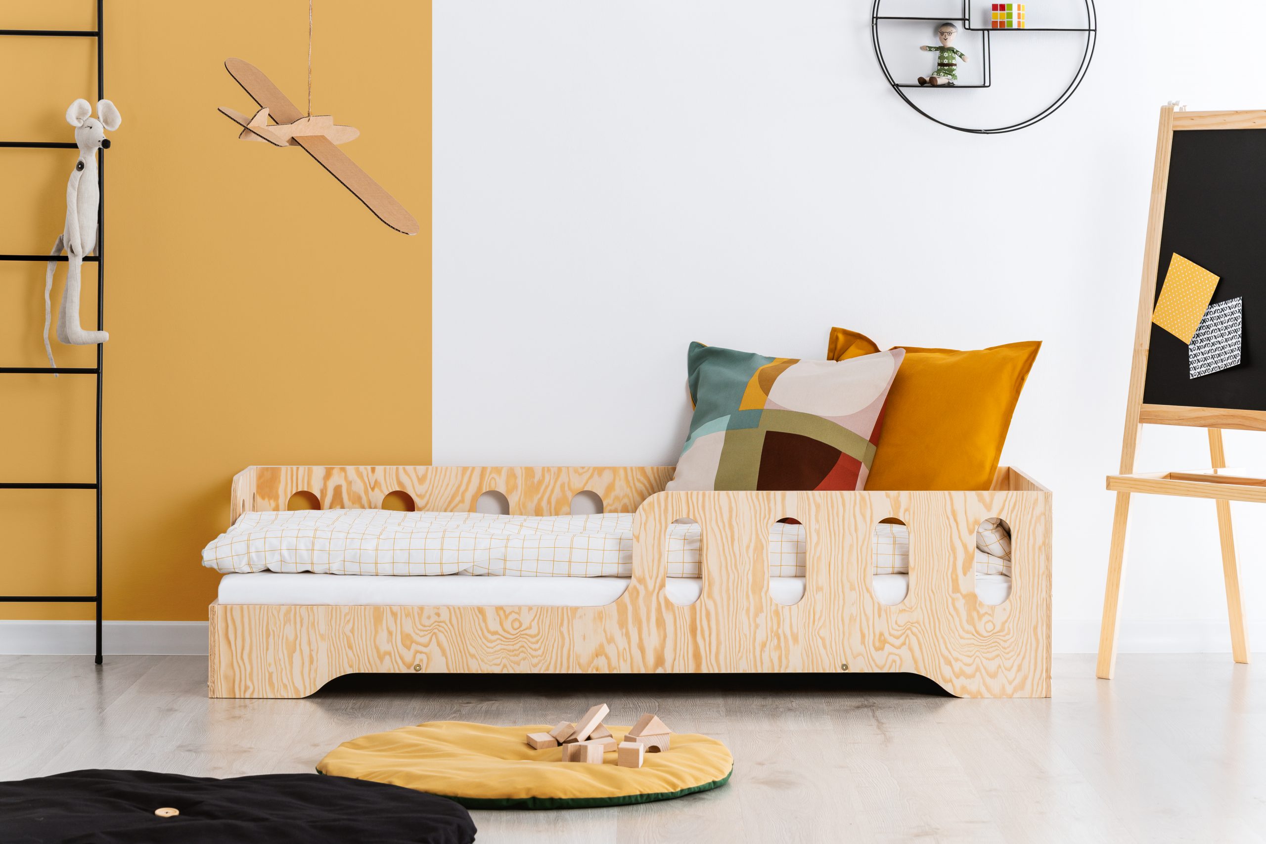 - Transition en douceur vers l’indépendance : Le lit « Ethan » a été pensé pour faciliter la transition du lit de bébé au lit d’enfant. Sa structure proche du sol, combinée à sa barrière chic, assure la sécurité et le confort de votre enfant, l’aidant à se sentir en sécurité pendant cette étape importante de son développement. De plus, sa structure en bois non verni ajoute une touche moderne à votre intérieur, faisant du lit « Ethan » un choix à la fois pratique et esthétiquement plaisant.